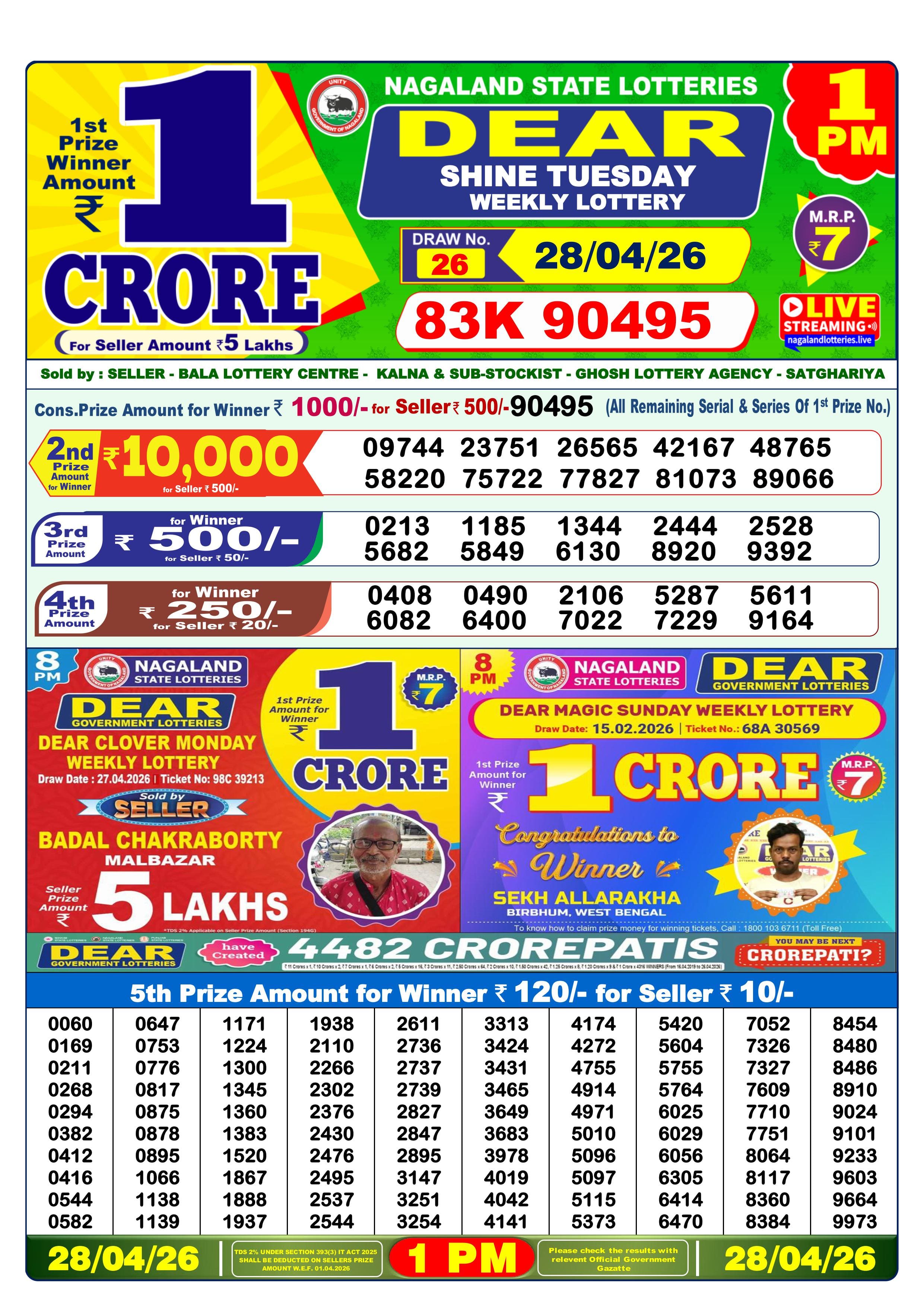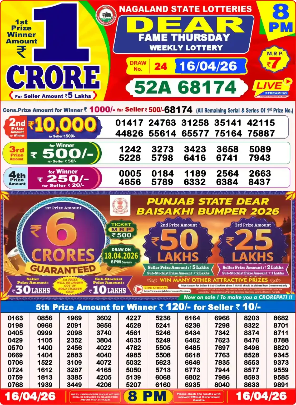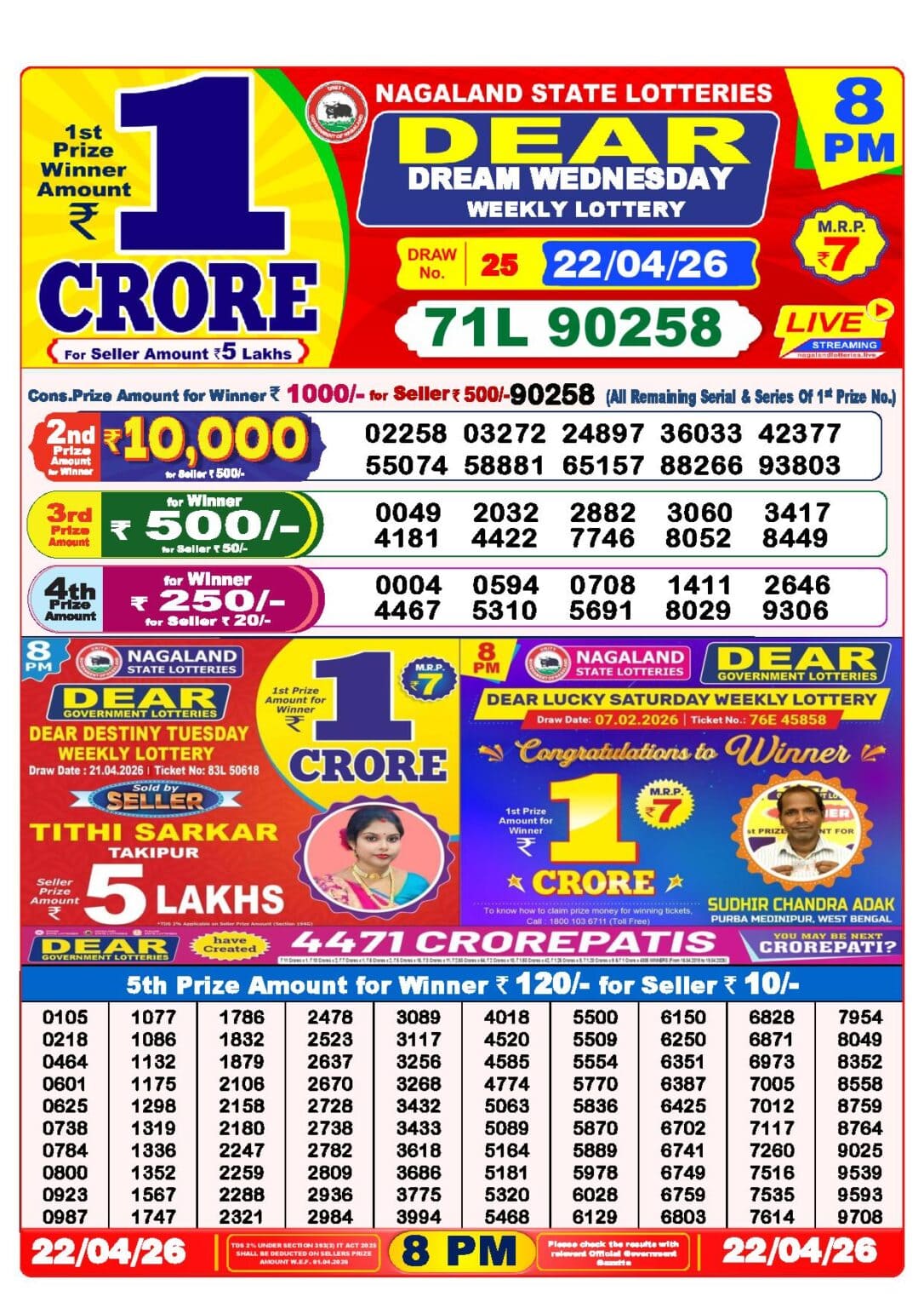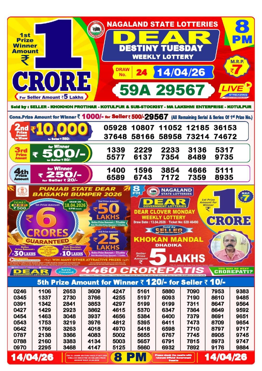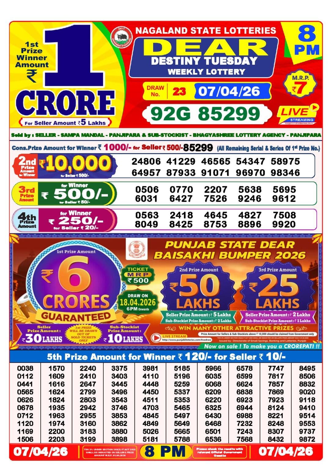 Do you want to see the result of Dear Lottery Result Today 1 PM, 6 PM, or 8 PM? Then you have come to the right place. We publish all results of Nagaland State Lottery Result 1 PM, Dear Lottery Result Today, Lottery Sambad Morning Draw List, Nagaland State Lottery Result Morning Draw List, Nagaland State Lottery Result 6 PM, Dear Lottery Result Today 6 PM, Lottery Sambad Evening Draw List, Nagaland State Lottery Result Evening Draw List, Nagaland State Lottery Result 8 PM, Dear Lottery Result Today 8 PM, Lottery Sambad Night Draw List, ডিয়ার লটারি, ডিয়ার লটারি রেজাল্ট, লটারি সংবাদ and Nagaland State Lottery Result Night Draw List on this website every day at the right time. This Dear Lottery Result Today has a 1st prize of 1 crore, 2nd Prize of 9000 Rupees, 3rd Prize of 450 Rupees, 4th Prize of 250 Rupees and 5th Prize of 120 Rupees. Nagaland State Lottery department released Today’s Dear Lottery Result. Today’s result is given below.