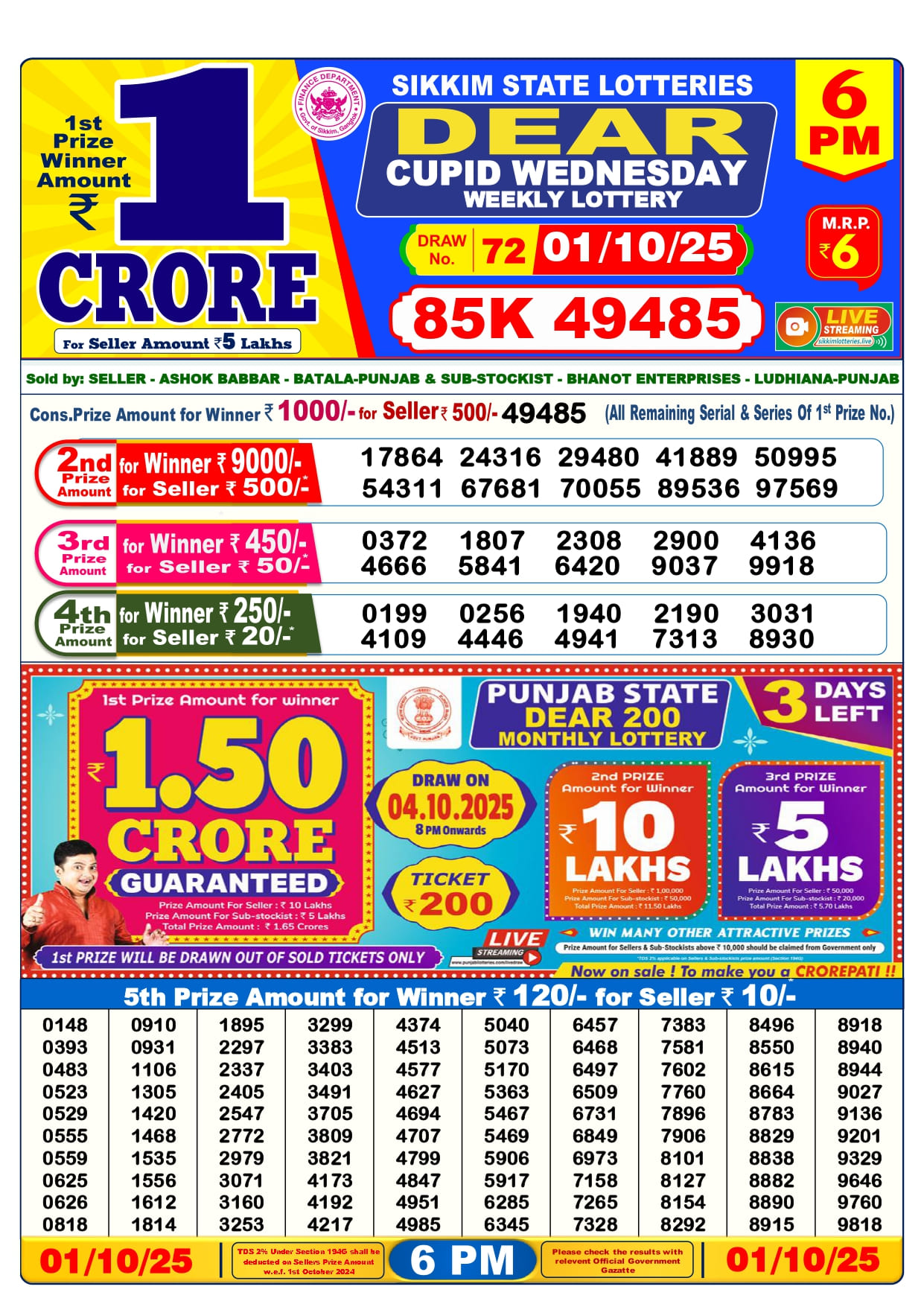 The Nagaland State Lottery Department has released today’s 1 Tarikh Lottery Sambad 6 pm Evening results. Check your today’s fortune result. Today 1 Tarikh Lottery Sambad 6 PM 1st Prize is – 85K 49485, 2nd Prize– 17864 24316 29480 41889 50995 54311 67681 70055 89536 97569, 3rd Prize– 0372 1807 2308 2900 4136 4666 5841 6420 9037 9918, 4th Prize– 0199 0256 1940 2190 3031 4109 4446 4941 7313 8930 and more results are given below.