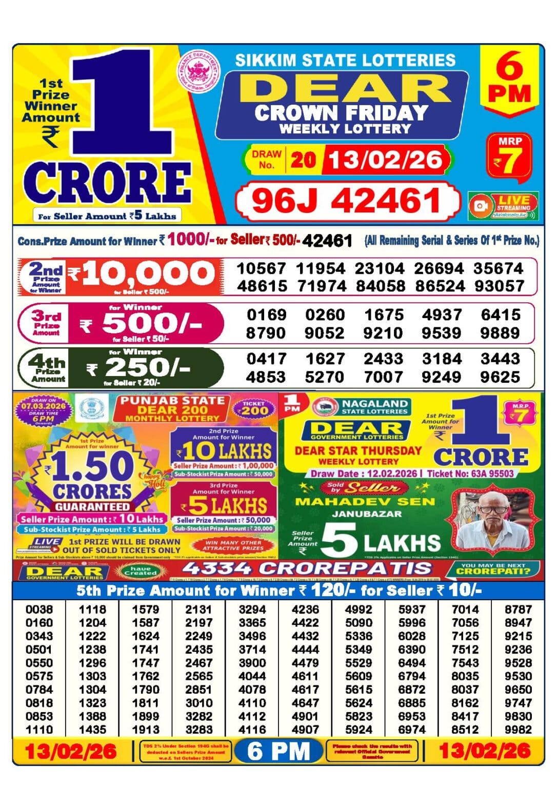 13 Tarik Lottery Result 6 pm. The Nagaland State Lottery Department has released today’s results. Check your today’s fortune result. This 13 Tarik Lottery Result 6 pm has a 1st prize of 1 crore, 2nd Prize of 9000 Rupees, 3rd Prize of 450 Rupees, 4th Prize of 250 Rupees and 5th Prize of 120 Rupees. Today 13 Tarik Lottery Result 6 PM 1st Prize is – 91J 86799, 2nd Prize– 03378 15514 52254 62446 63147 65011 66075 79581 85593 86425, 3rd Prize– 0425 2660 3522 5228 7233 7863 8103 8107 8208 9873, 4th Prize– 0629 0854 1311 1458 2616 5286 5531 7143 7264 9131 and more results are given below.