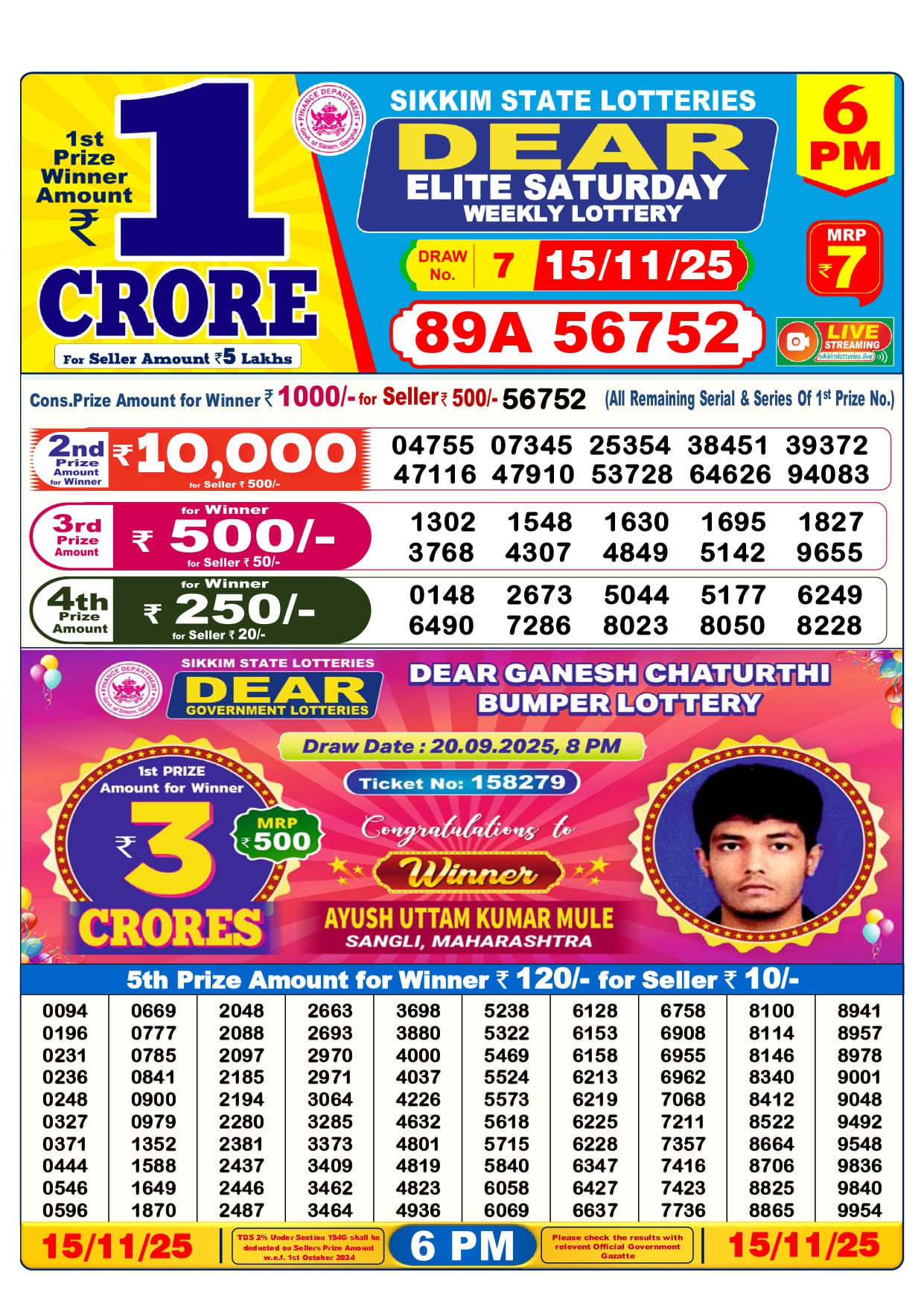 15 Tarik Lottery Result 6 pm. The Nagaland State Lottery Department has released today’s results. Check your today’s fortune result. This 15 Tarik Lottery Result 6 pm has a 1st prize of 1 crore, 2nd Prize of 9000 Rupees, 3rd Prize of 450 Rupees, 4th Prize of 250 Rupees and 5th Prize of 120 Rupees. Today 15 Tarik Lottery Result 6 PM 1st Prize is – 89A 56752, 2nd Prize– 04755 07345 25354 38451 39372 47116 47910 53728 64626 94083, 3rd Prize– 1302 1548 1630 1695 1827 3768 4307 4849 5142 9655, 4th Prize– 0148 2673 5044 5177 6249 6490 7286 8023 8050 8228 and more results are given below.