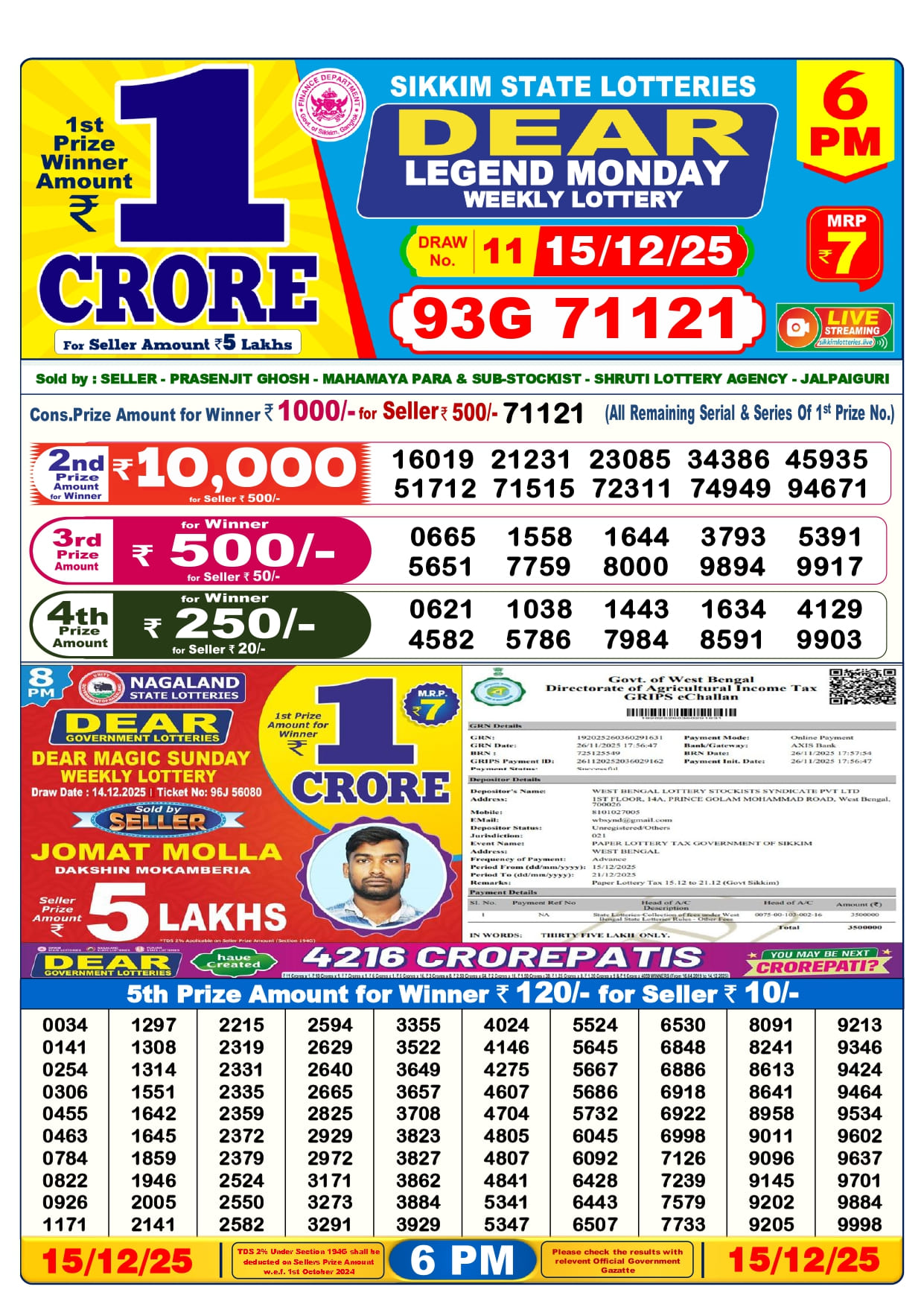 15 Tarik Lottery Sambad 6 pm. The Nagaland State Lottery Department has released today’s results. Check your today’s fortune result. This 15 Tarik Lottery Sambad 6 pm has a 1st prize of 1 crore, 2nd Prize of 9000 Rupees, 3rd Prize of 450 Rupees, 4th Prize of 250 Rupees and 5th Prize of 120 Rupees. Today 15 Tarik Lottery Sambad 6 PM 1st Prize is – 89A 56752, 2nd Prize– 04755 07345 25354 38451 39372 47116 47910 53728 64626 94083, 3rd Prize– 1302 1548 1630 1695 1827 3768 4307 4849 5142 9655, 4th Prize– 0148 2673 5044 5177 6249 6490 7286 8023 8050 8228 and more results are given below.