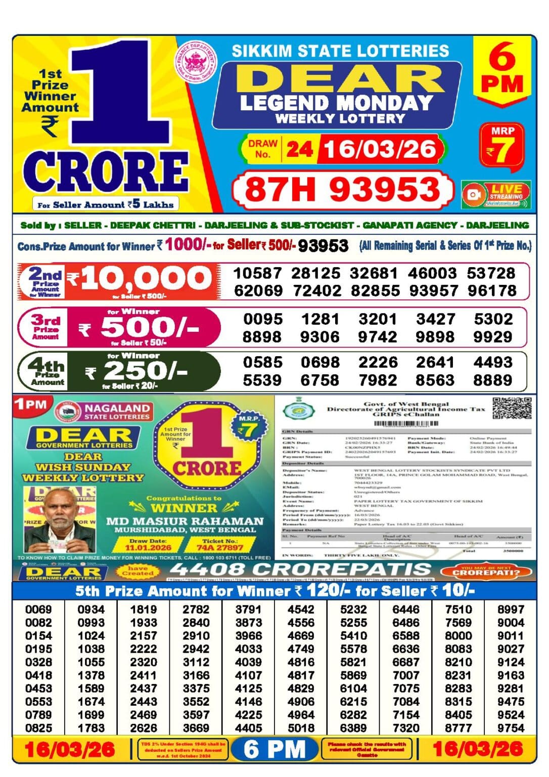 16 Tarikh Lottery Sambad Result 1 PM 6 PM 8 PM 16-03-2026