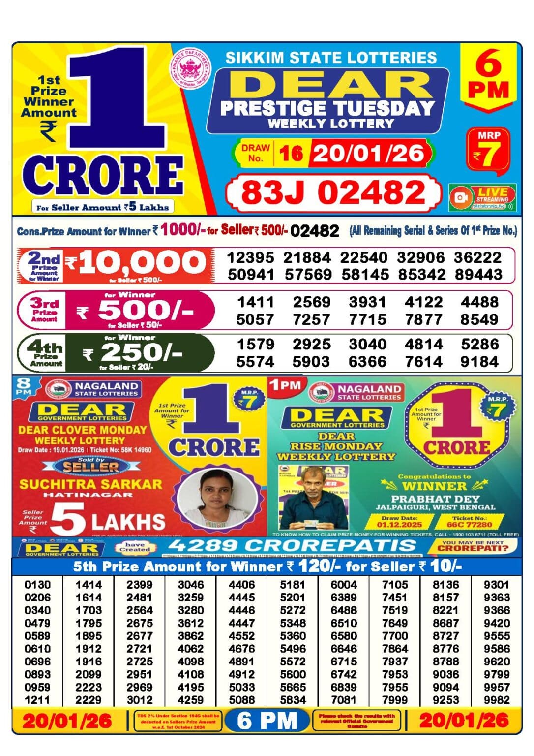 20 Tarik Lottery Result 6 pm. The Nagaland State Lottery Department has released today’s results. Check your today’s fortune result. This 20 Tarik Lottery Result 6 pm has a 1st prize of 1 crore, 2nd Prize of 9000 Rupees, 3rd Prize of 450 Rupees, 4th Prize of 250 Rupees and 5th Prize of 120 Rupees. Today 20 Tarik Lottery Result 6 PM 1st Prize is – 86A 76183, 2nd Prize– 17419 22555 28121 39981 43060 44011 46176 57023 57919 94573, 3rd Prize– 0719 0912 1425 5895 6919 7312 7675 8766 9413 9645, 4th Prize– 0365 0665 3208 3761 4047 5307 5312 5540 7259 9886 and more results are given below.