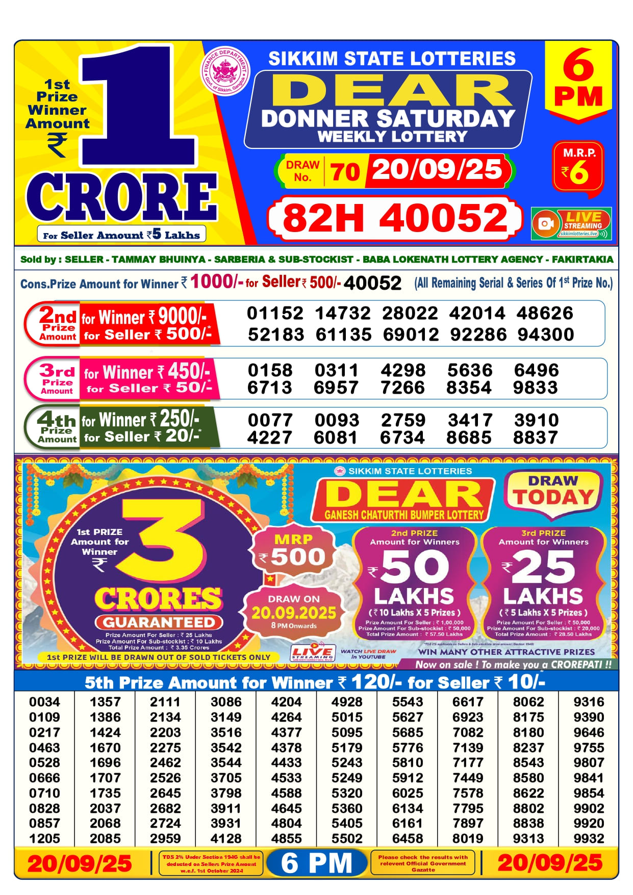 20 Tarikh Lottery Sambad 6 PM Evening Result
