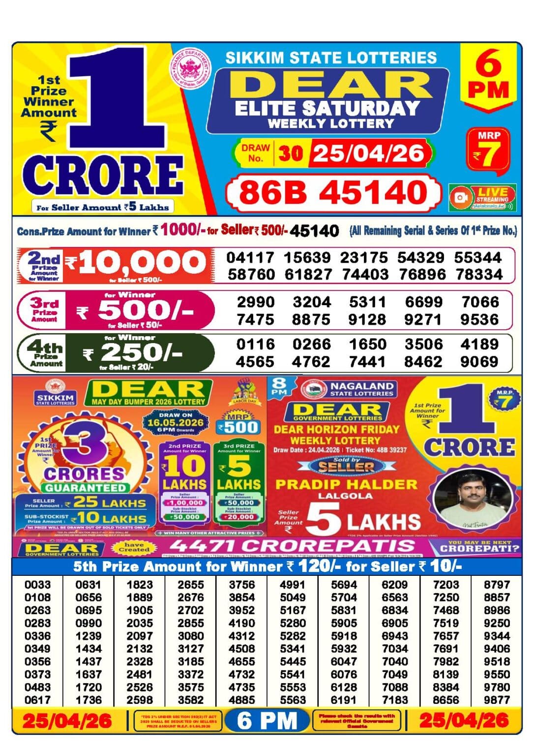 25 Tarik Lottery Result 6 pm. The Nagaland State Lottery Department has released today’s results. Check your today’s fortune result. This 25 Tarik Lottery Result 6 pm has a 1st prize of 1 crore, 2nd Prize of 9000 Rupees, 3rd Prize of 450 Rupees, 4th Prize of 250 Rupees and 5th Prize of 120 Rupees. Today 25 Tarik Lottery Result 6 PM 1st Prize is – 80B 24526, 2nd Prize– 12064 14430 14674 25573 26243 38823 46784 60066 62241 97286, 3rd Prize– 0503 0958 1563 2321 3799 5894 6072 6509 8560 9391, 4th Prize– 0196 0814 2030 4566 5338 5478 6200 7935 8962 9709 and more results are given below.
