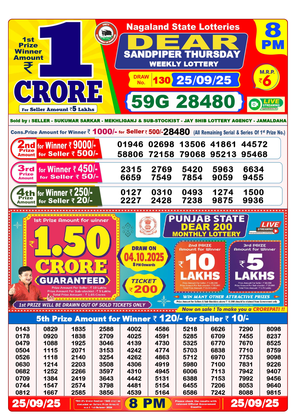 Do you want to see the result of 25 Tarikh Lottery Sambad 1 PM, 6 PM & 8 PM Nagaland State Result? Then you have come to the right place. We publish all results of Nagaland State Lottery, Lottery Sambad Morning Draw List, Lottery Sambad Night Draw List, Lottery Sambad Evening Draw List, and Lottery Result Sambad on this website every day at the right time. This 25 Tarikh Lottery Sambad has a 1st prize of 1 crore, 2nd Prize of 9000 Rupees, 3rd Prize of 450 Rupees, 4th Prize of 250 Rupees and 5th Prize of 120 Rupees. Nagaland State Lottery department released today 25 Tarikh Lottery Sambad result. Today’s all result is given below.