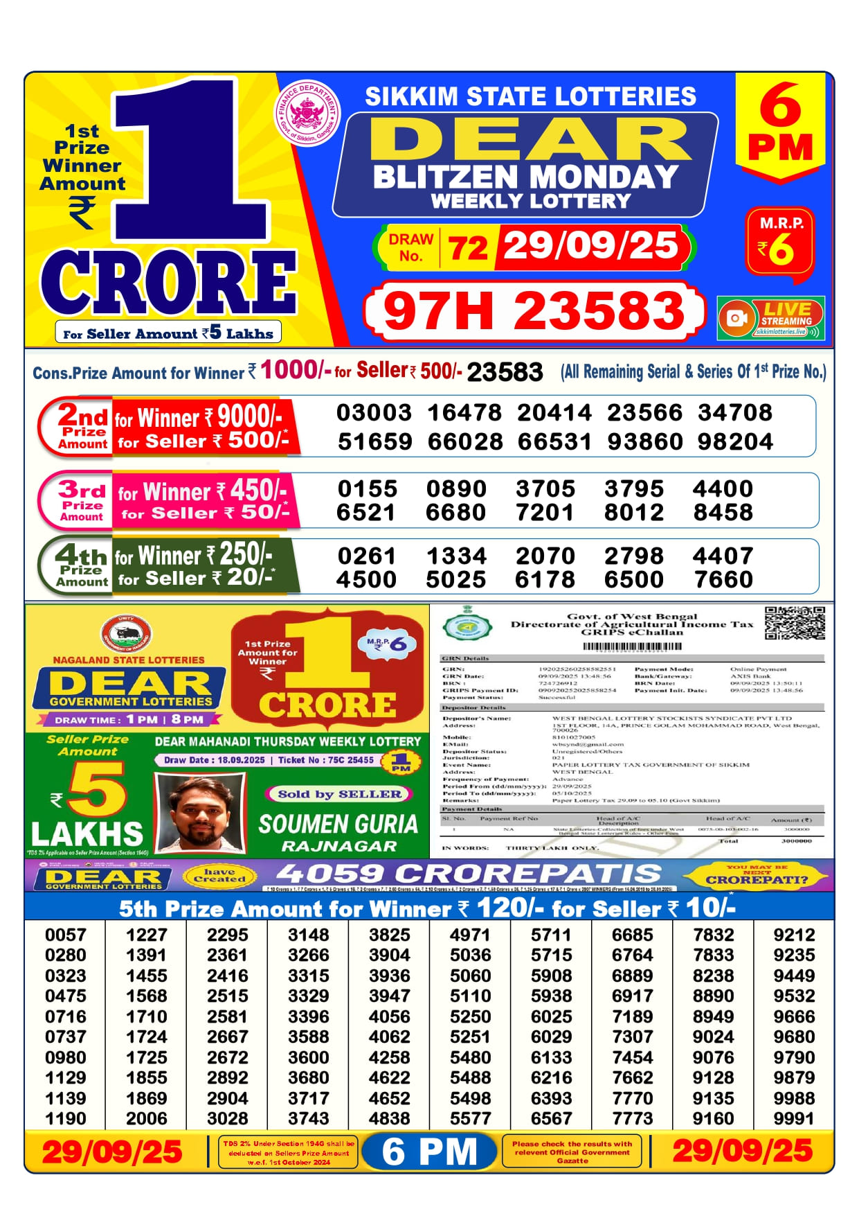 The Nagaland State Lottery Department has released today’s 29 Tarikh Lottery Sambad 1 pm Morning results. Check your today’s fortune result. Today 29 Tarikh Lottery Sambad 1 PM 1st Prize is – 57B 72551, 2nd Prize– 10870 17027 30010 37771 40531 52843 68861 70946 86489 91737, 3rd Prize– 0516 2412 3319 5625 5747 5823 6228 7816 8838 9371, 4th Prize– 0937 2106 2713 5983 5986 7269 8223 8290 9391 9511 and more results are given below.