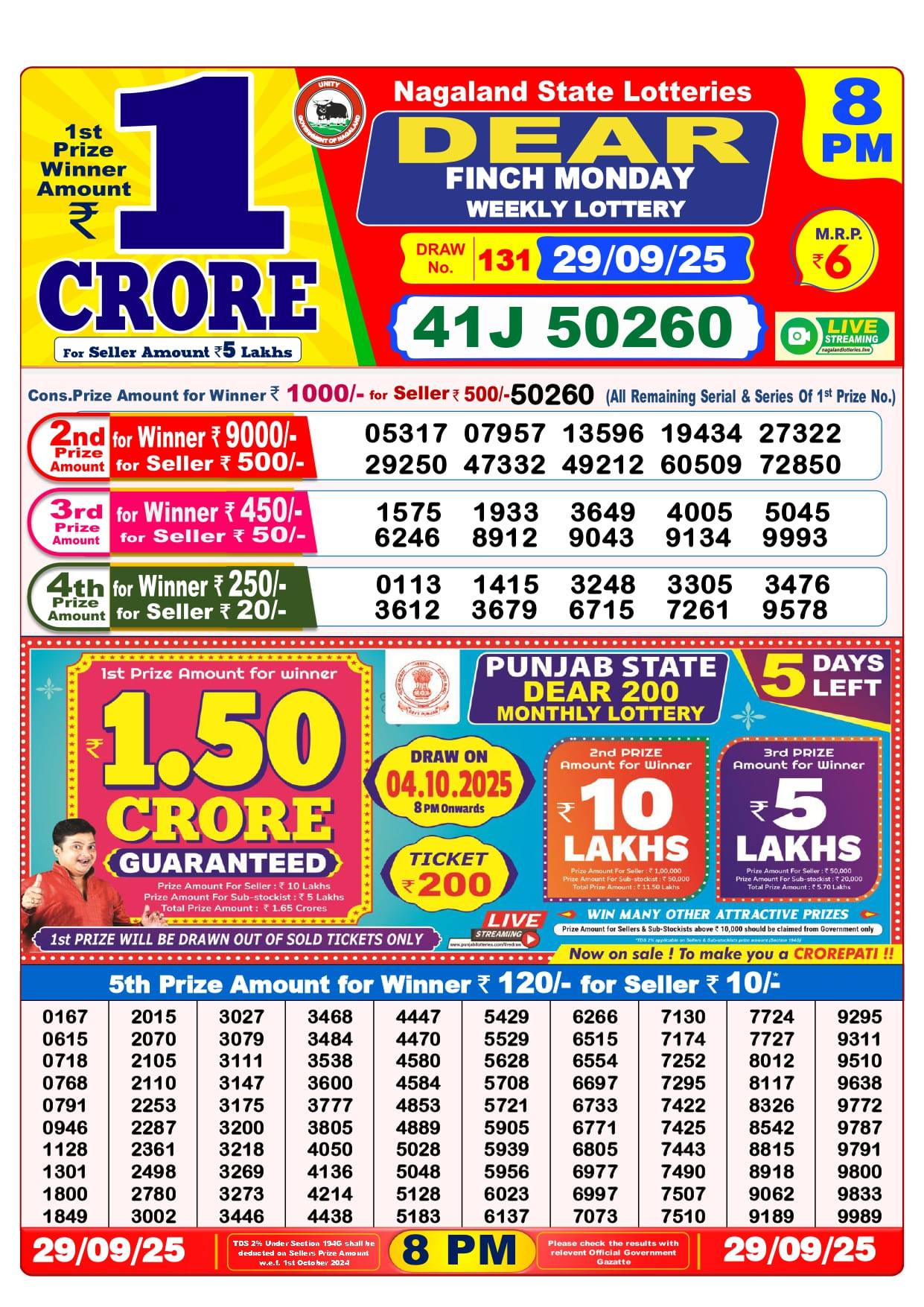 Do you want to see the result of 29 Tarikh Lottery Sambad 1 PM, 6 PM & 8 PM Nagaland State Result? Then you have come to the right place. We publish all results of Nagaland State Lottery, Lottery Sambad Morning Draw List, Lottery Sambad Night Draw List, Lottery Sambad Evening Draw List, and Lottery Result Sambad on this website every day at the right time. This 29 Tarikh Lottery Sambad has a 1st prize of 1 crore, 2nd Prize of 9000 Rupees, 3rd Prize of 450 Rupees, 4th Prize of 250 Rupees and 5th Prize of 120 Rupees. Nagaland State Lottery department released today 29 Tarikh Lottery Sambad result. Today’s all result is given below.