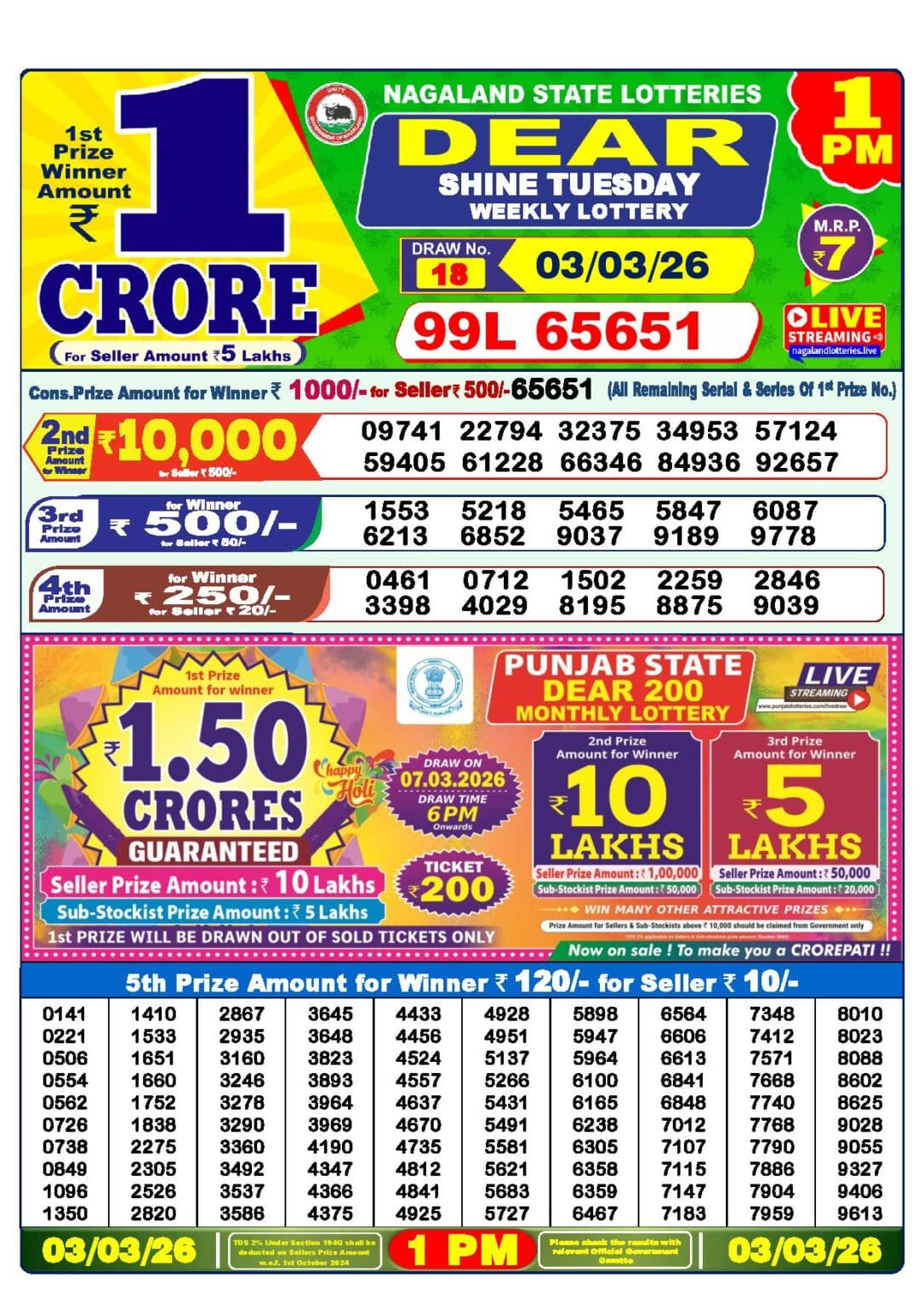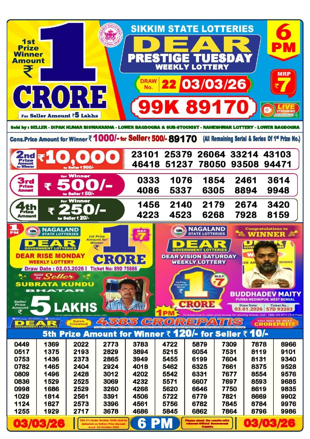 3 Tarik Lottery Sambad 6 pm. The Nagaland State Lottery Department has released today’s results. Check your today’s fortune result. This 3 Tarik Lottery Sambad has a 1st prize of 1 crore, 2nd Prize of 9000 Rupees, 3rd Prize of 450 Rupees, 4th Prize of 250 Rupees and 5th Prize of 120 Rupees. Today 3 Tarik Lottery Sambad 6 PM 1st Prize is – 98B 81964, 2nd Prize– 00708 01984 17920 39026 40677 40757 53046 66302 72653 80219, 3rd Prize– 0189 0379 1573 2025 2407 2474 4194 5520 7800 8981, 4th Prize– 0328 0693 1457 1541 1584 5146 5201 5775 6553 7652 and more results are given below.