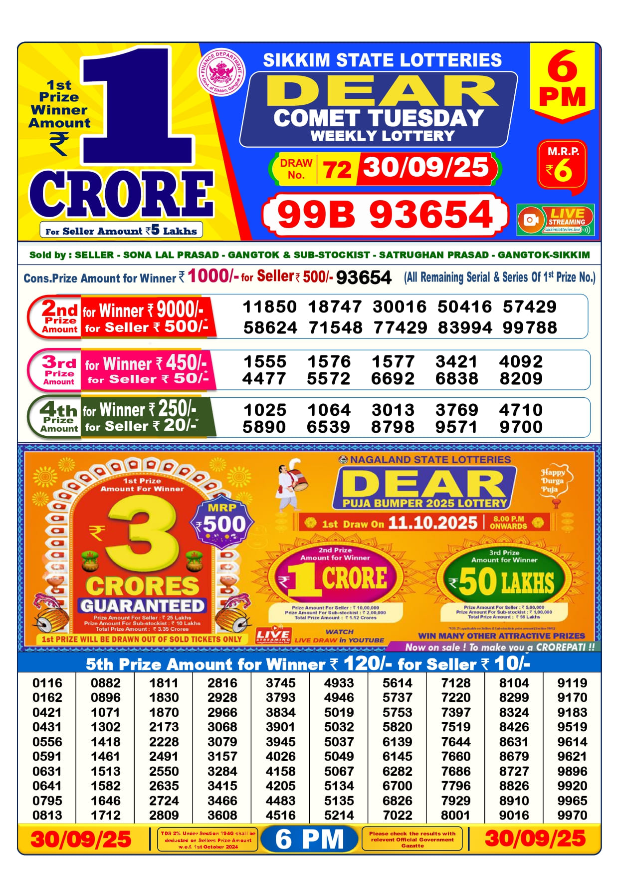 The Nagaland State Lottery Department has released today’s 30 Tarikh Lottery Sambad 6 pm Evening results. Check your today’s fortune result. Today 30 Tarikh Lottery Sambad 6 PM 1st Prize is – 93B 53150, 2nd Prize– 21435 29043 57245 60790 81225 89515 92237 93140 98850 99086, 3rd Prize– 0557 0862 2885 3447 4684 5980 7130 7886 7918 9012, 4th Prize– 0055 0331 2748 3030 3883 6015 6890 6975 7243 7977 and more results are given below.