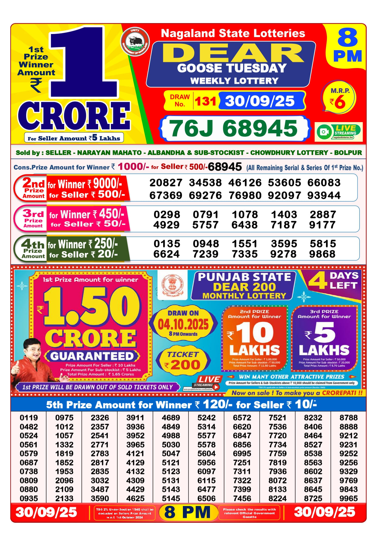 Do you want to see the result of 30 Tarikh Lottery Sambad 1 PM, 6 PM & 8 PM Nagaland State Result? Then you have come to the right place. We publish all results of Nagaland State Lottery, Lottery Sambad Morning Draw List, Lottery Sambad Night Draw List, Lottery Sambad Evening Draw List, and Lottery Result Sambad on this website every day at the right time. This 30 Tarikh Lottery Sambad has a 1st prize of 1 crore, 2nd Prize of 9000 Rupees, 3rd Prize of 450 Rupees, 4th Prize of 250 Rupees and 5th Prize of 120 Rupees. Nagaland State Lottery department released today 30 Tarikh Lottery Sambad result. Today’s all result is given below.