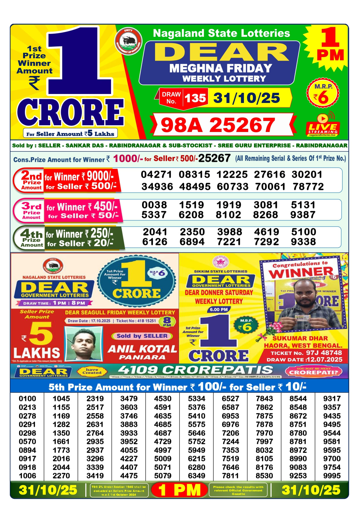 31 Tarik Lottery Sambad 1 pm. The Nagaland State Lottery Department has released today’s results. Check your today’s fortune result. This 31 Tarik Lottery Sambad 1 pm has a 1st prize of 1 crore, 2nd Prize of 9000 Rupees, 3rd Prize of 450 Rupees, 4th Prize of 250 Rupees and 5th Prize of 120 Rupees. Today 31 Tarik Lottery Sambad 1 PM 1st Prize is – 98A 25267, 2nd Prize– 04271 08315 12225 27616 30201 34936 48495 60733 70061 78772, 3rd Prize– 0038 1519 1919 3081 5131 5337 6208 8102 8268 9387, 4th Prize– 2041 2350 3988 4619 5100 6126 6894 7221 7292 9338 and more results are given below.