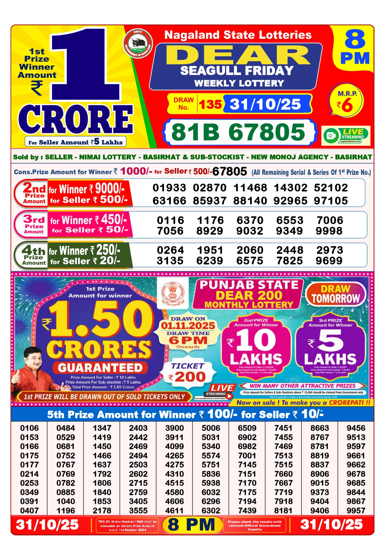 31 Tarik Lottery Sambad 8 pm. The Nagaland State Lottery Department has released today’s results. Check your today’s fortune result. This 31 Tarik Lottery Sambad 8 pm has a 1st prize of 1 crore, 2nd Prize of 9000 Rupees, 3rd Prize of 450 Rupees, 4th Prize of 250 Rupees and 5th Prize of 120 Rupees. Today 31 Tarik Lottery Sambad 8 PM 1st Prize is – 81B 67805, 2nd Prize– 01933 02870 11468 14302 52102 63166 85937 88140 92965 97105, 3rd Prize– 0116 1176 6370 6553 7006 7056 8929 9032 9349 9998, 4th Prize– 0264 1951 2060 2448 2973 3135 6239 6575 7825 9699 and more results are given below.
