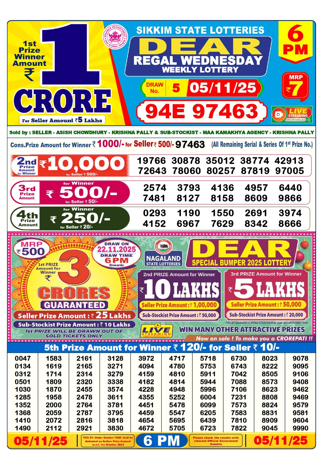 5 Tarik Lottery Result 6 pm. The Nagaland State Lottery Department has released today’s results. Check your today’s fortune result. This 5 Tarik Lottery Result 6 pm has a 1st prize of 1 crore, 2nd Prize of 9000 Rupees, 3rd Prize of 450 Rupees, 4th Prize of 250 Rupees and 5th Prize of 120 Rupees. Today 5 Tarik Lottery Result 6 PM 1st Prize is – 94E 97463, 2nd Prize– 19766 30878 35012 38774 42913 72643 78060 80257 87819 97005, 3rd Prize– 2574 3793 4136 4957 6440 7481 8127 8158 8609 9866, 4th Prize– 0293 1190 1550 2691 3974 4152 6967 7629 8342 8666 and more results are given below.