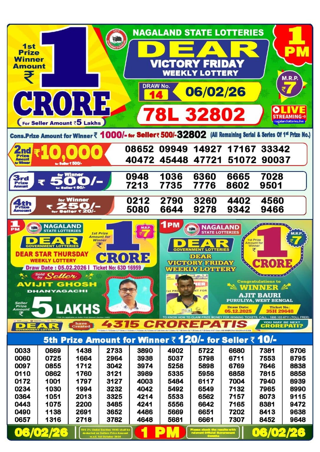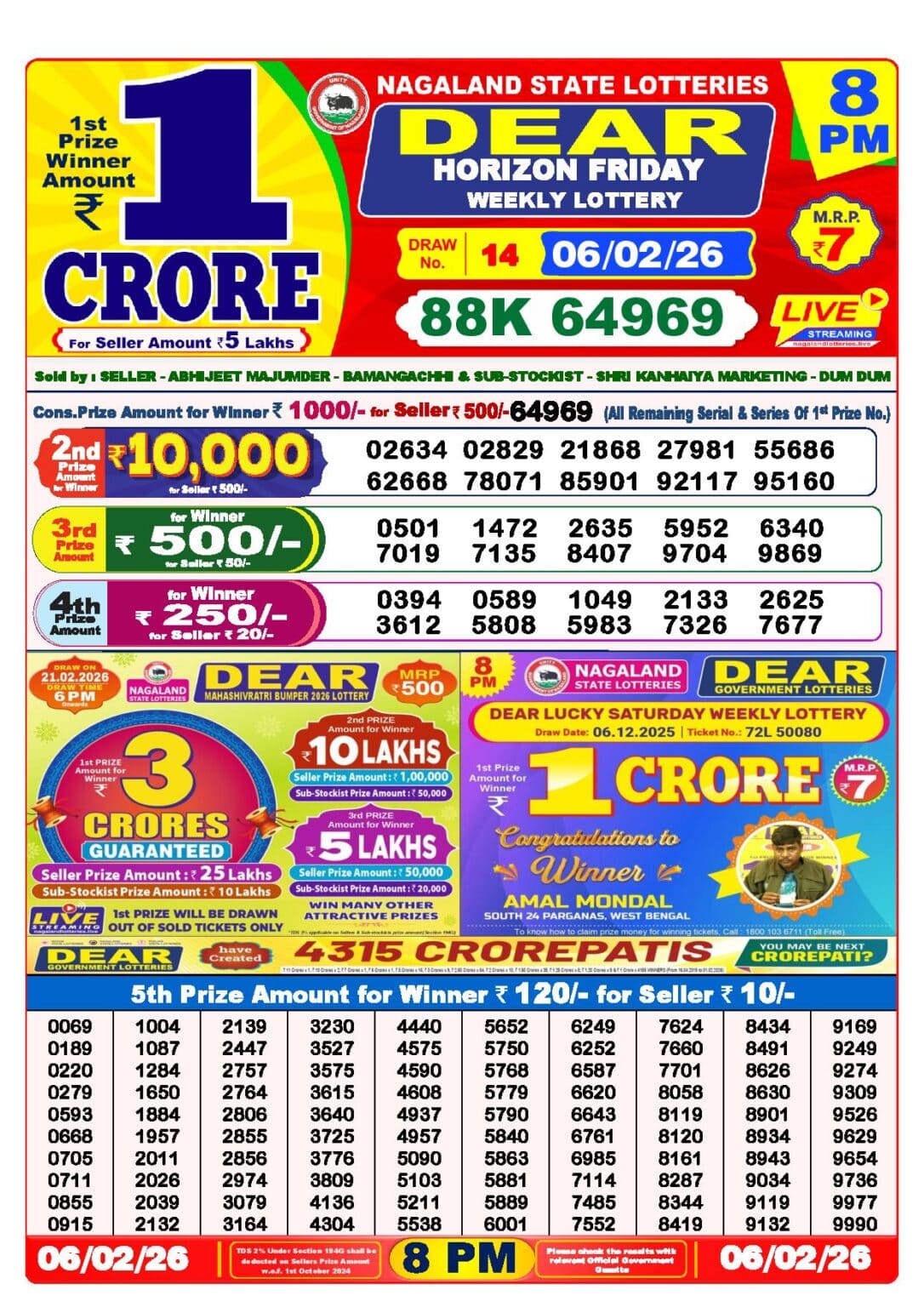 6 Tarik Lottery Result 6 pm. The Nagaland State Lottery Department has released today’s results. Check your today’s fortune result. This 6 Tarik Lottery Result 6 PM has a 1st prize of 1 crore, 2nd Prize of 9000 Rupees, 3rd Prize of 450 Rupees, 4th Prize of 250 Rupees and 5th Prize of 120 Rupees. Today 6 Tarik Lottery Result 6 PM 1st Prize is – 99B 28358, 2nd Prize– 07371 11429 11814 16535 36445 48592 50546 73923 80461 91239, 3rd Prize– 0247 0375 0428 2050 3272 5303 5497 6623 7175 8109, 4th Prize– 1981 4263 5793 6328 7708 7922 7983 8149 8435 9178 and more results are given below.