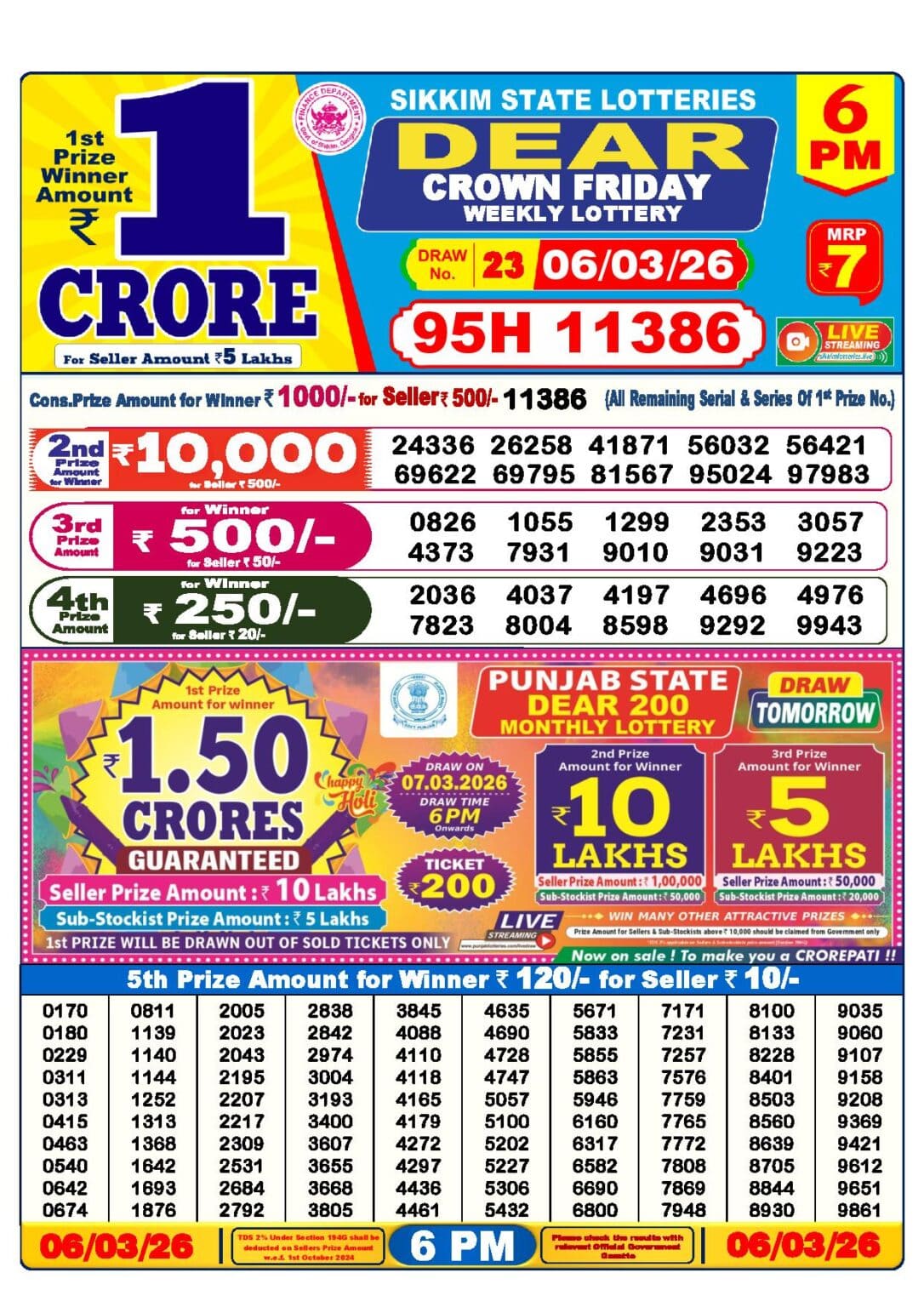 6 Tarik Lottery Result 6 pm. The Nagaland State Lottery Department has released today’s results. Check your today’s fortune result. This 6 Tarik Lottery Result 6 PM has a 1st prize of 1 crore, 2nd Prize of 9000 Rupees, 3rd Prize of 450 Rupees, 4th Prize of 250 Rupees and 5th Prize of 120 Rupees. Today 6 Tarik Lottery Result 6 PM 1st Prize is – 99B 28358, 2nd Prize– 07371 11429 11814 16535 36445 48592 50546 73923 80461 91239, 3rd Prize– 0247 0375 0428 2050 3272 5303 5497 6623 7175 8109, 4th Prize– 1981 4263 5793 6328 7708 7922 7983 8149 8435 9178 and more results are given below.