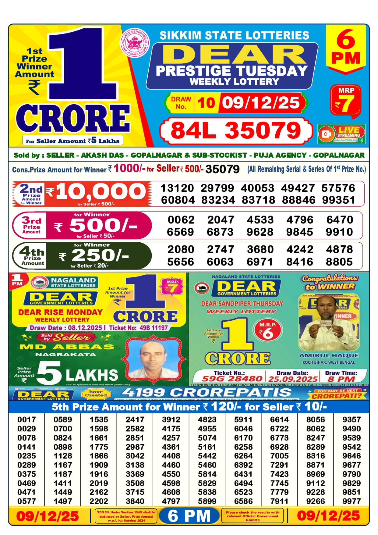 9 Tarik Lottery Sambad 6 pm. The Nagaland State Lottery Department has released today’s results. Check your today’s fortune result. This 9 Tarik Lottery Sambad 6 pm has a 1st prize of 1 crore, 2nd Prize of 9000 Rupees, 3rd Prize of 450 Rupees, 4th Prize of 250 Rupees and 5th Prize of 120 Rupees. Today 9 Tarik Lottery Sambad 6 PM 1st Prize is – 84L 35079, 2nd Prize– 13120 29799 40053 49427 57576 60804 83234 83718 88846 99351, 3rd Prize– 0062 2047 4533 4796 6470 6569 6873 9628 9845 9910, 4th Prize– 2080 2747 3680 4242 4878 5656 6063 6971 8416 8805 and more results are given below.