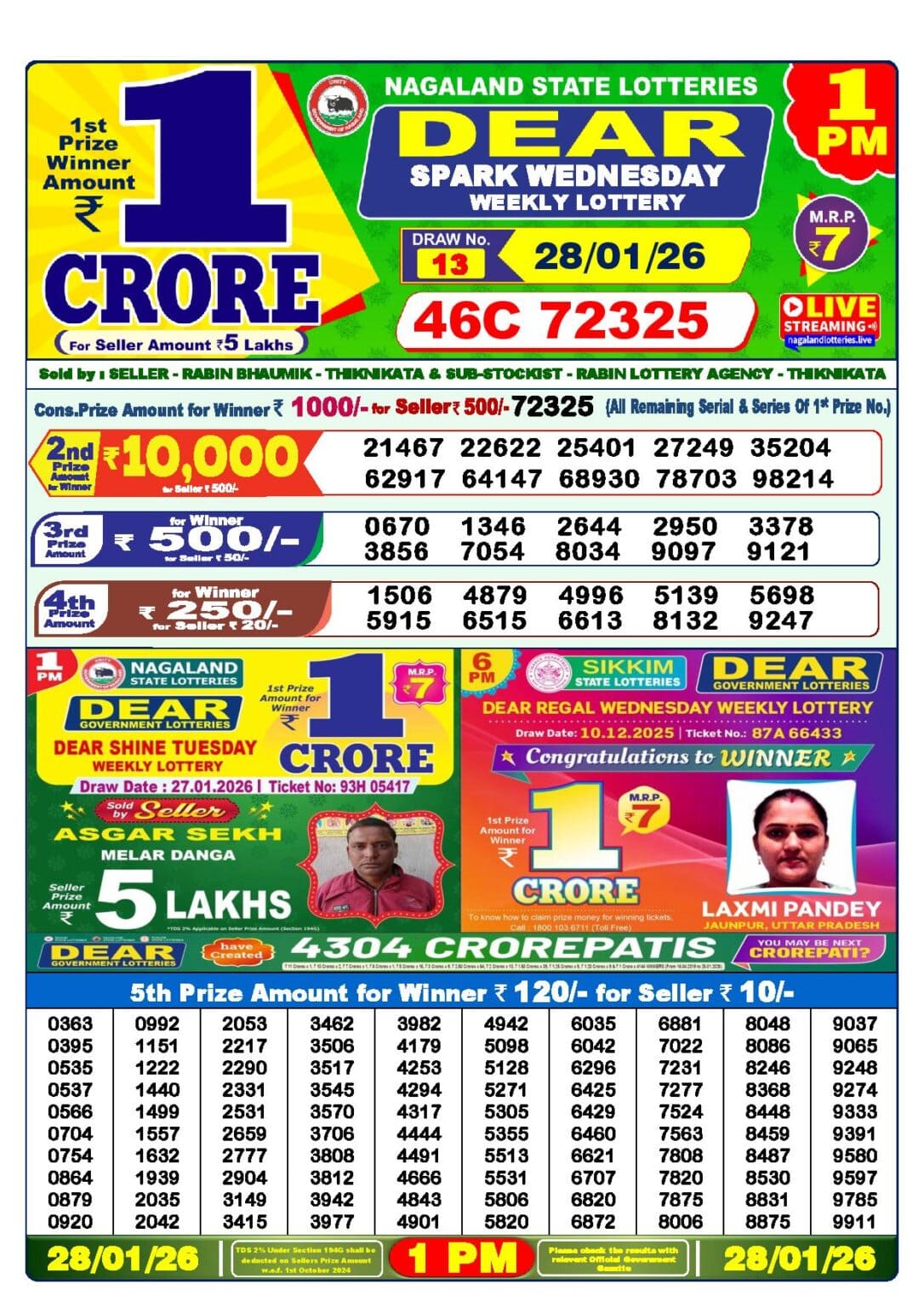 Dear Lottery Result Today 1PM Draw Schedule & Names