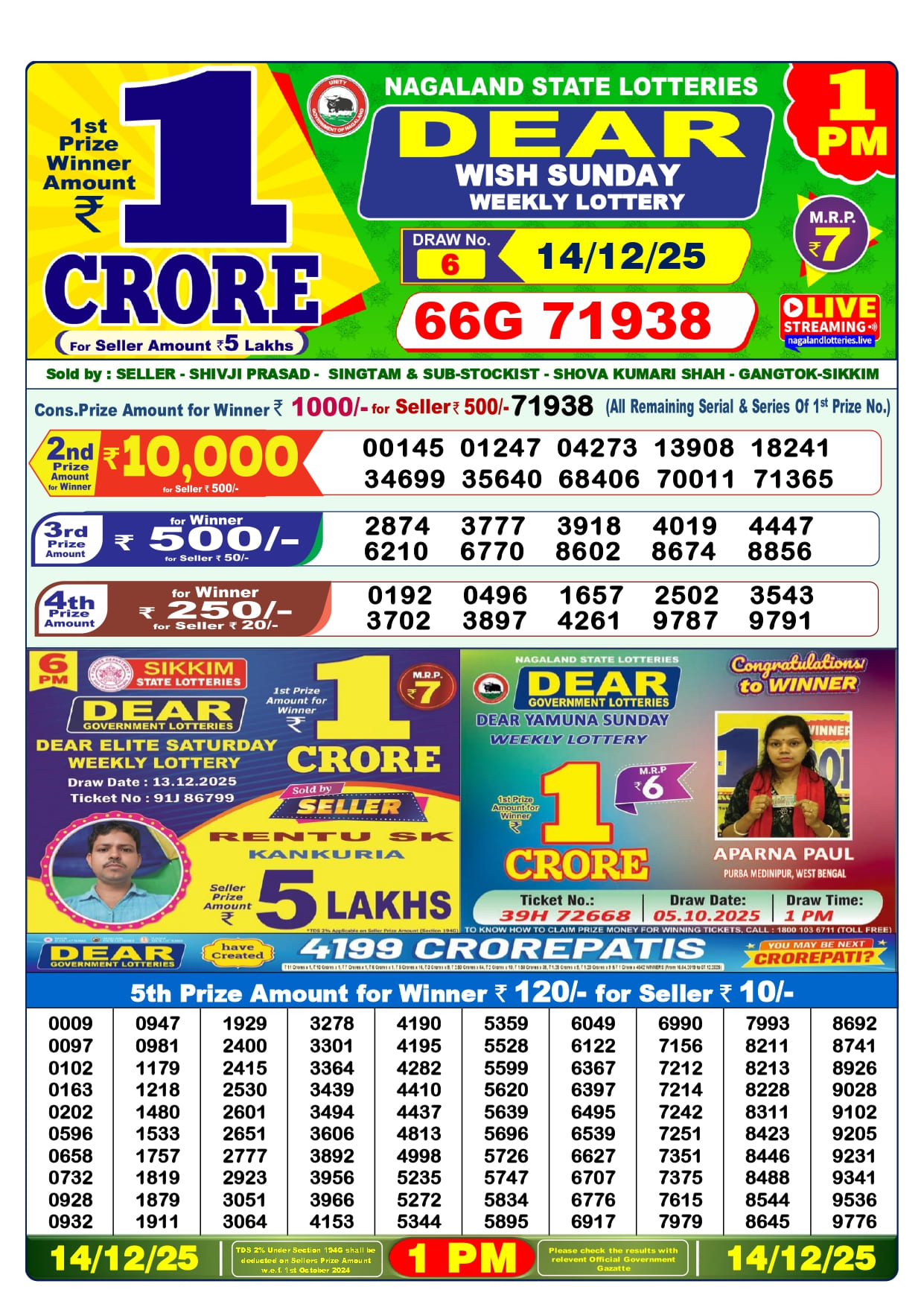 Nagaland State Lottery 14 Tarik 6 pm. The Nagaland State Lottery Department has released today’s results. Check your today’s fortune result. This Nagaland State Lottery 14 Tarik 6 pm has a 1st prize of 1 crore, 2nd Prize of 9000 Rupees, 3rd Prize of 450 Rupees, 4th Prize of 250 Rupees and 5th Prize of 120 Rupees. Today Nagaland State Lottery 14 Tarik 6 PM 1st Prize is – 98A 25565, 2nd Prize– 12274 19063 55848 60695 65776 77807 78624 82698 90477 98097, 3rd Prize– 0045 0518 1428 1905 4820 5501 6614 6653 6721 7706, 4th Prize– 0513 1258 1300 2393 3178 3817 5359 6985 8493 9038 and more results are given below.