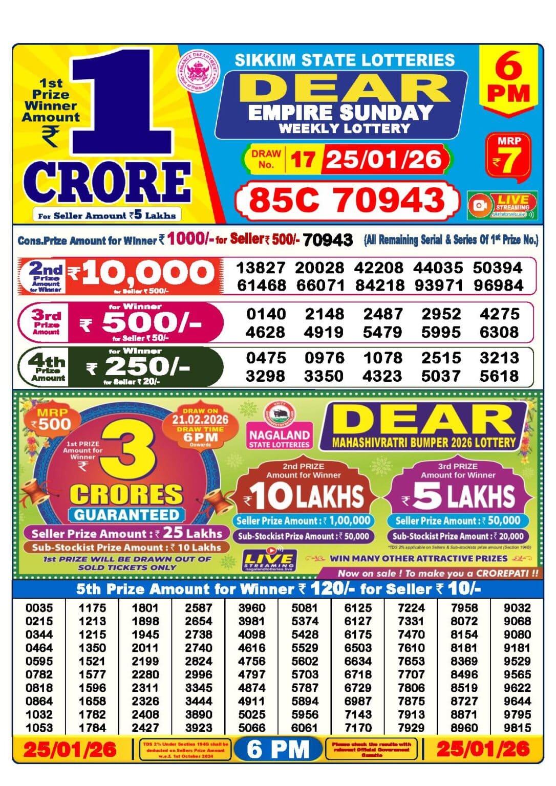 Dear Lottery 25 Tarik 6 pm. The Nagaland State Lottery Department has released today’s results. Check your today’s fortune result. This Dear Lottery 25 Tarik 6 pm has a 1st prize of 1 crore, 2nd Prize of 9000 Rupees, 3rd Prize of 450 Rupees, 4th Prize of 250 Rupees and 5th Prize of 120 Rupees. Today Dear Lottery 25 Tarik 6 PM 1st Prize is – 80B 24526, 2nd Prize– 12064 14430 14674 25573 26243 38823 46784 60066 62241 97286, 3rd Prize– 0503 0958 1563 2321 3799 5894 6072 6509 8560 9391, 4th Prize– 0196 0814 2030 4566 5338 5478 6200 7935 8962 9709 and more results are given below.