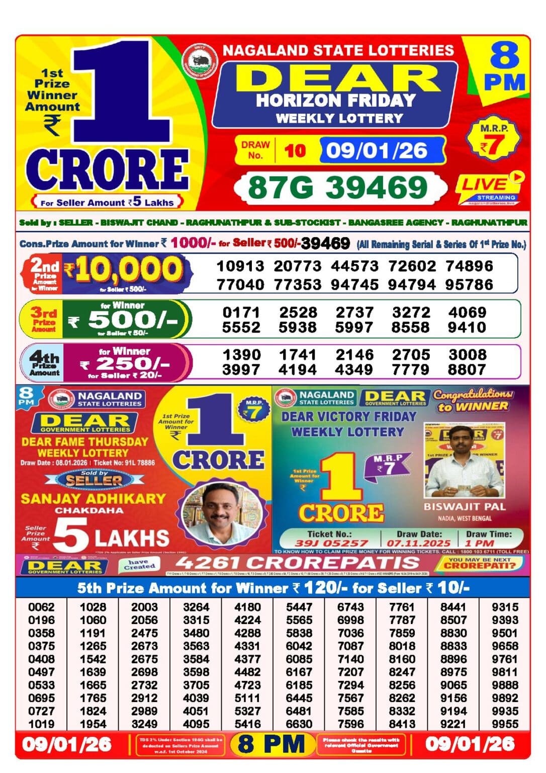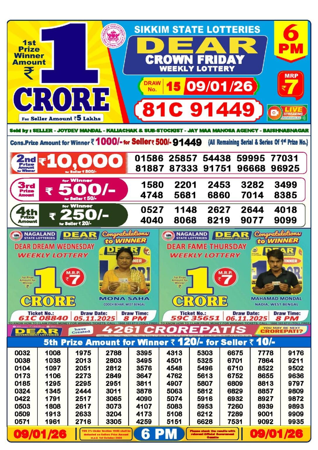 Dear Lottery 9 Tarikh Result 1 PM 6 PM 8 PM 09-01-2026