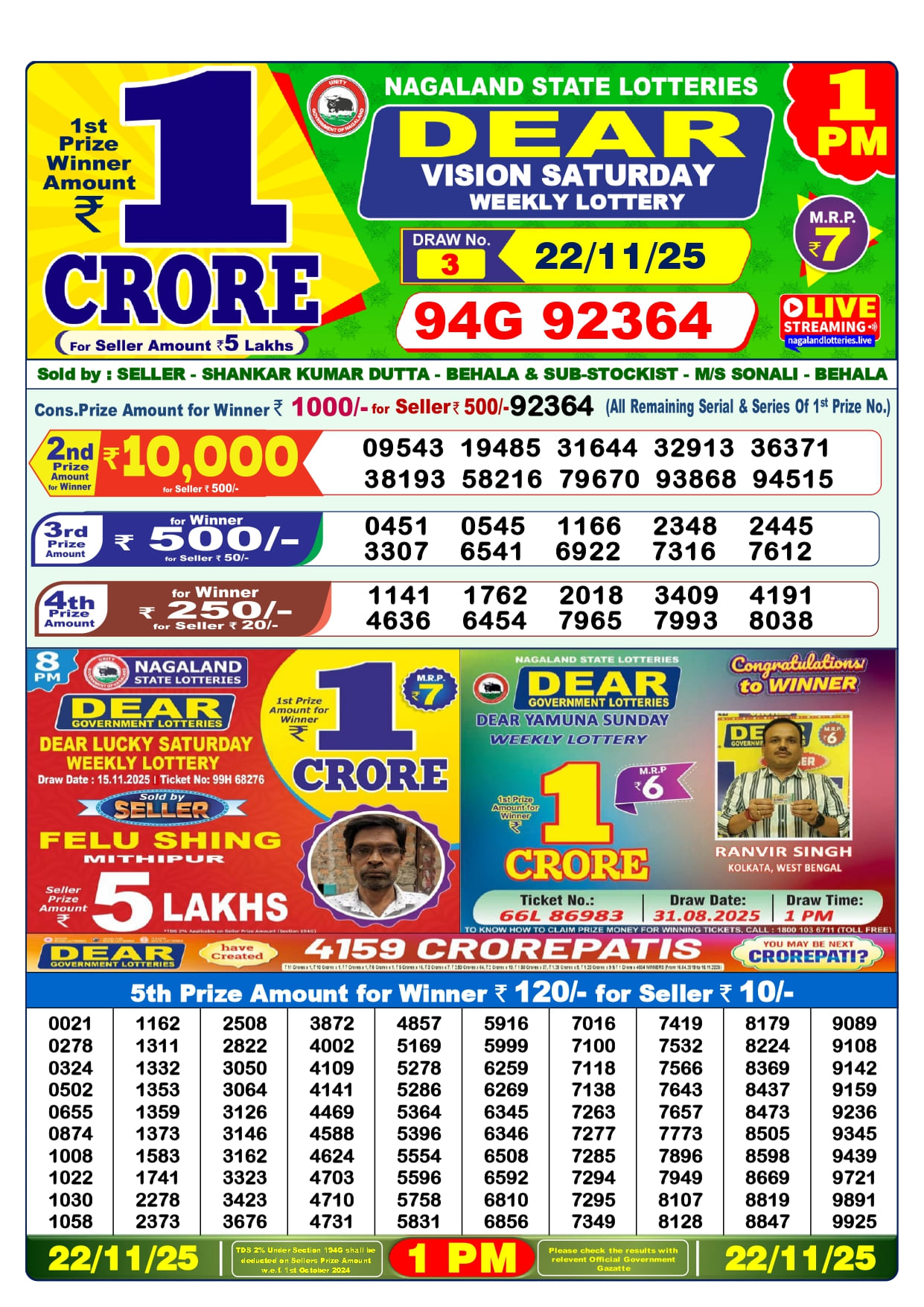 Lottery Sambad 22 Tarik Details