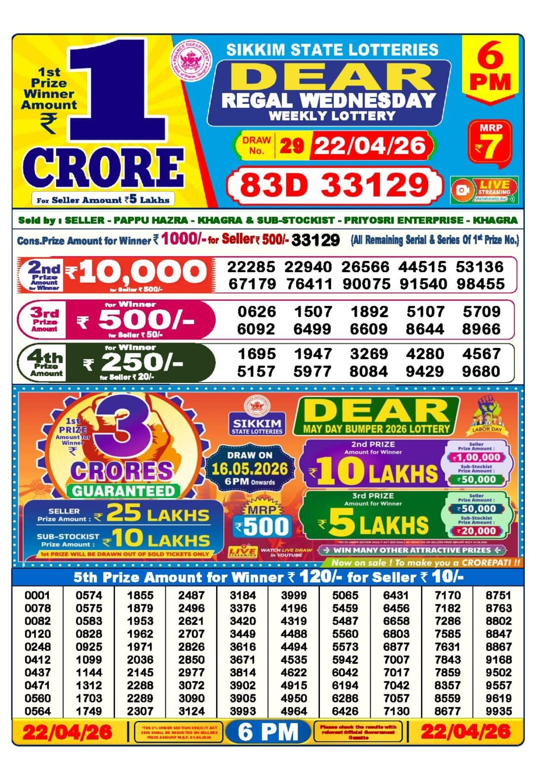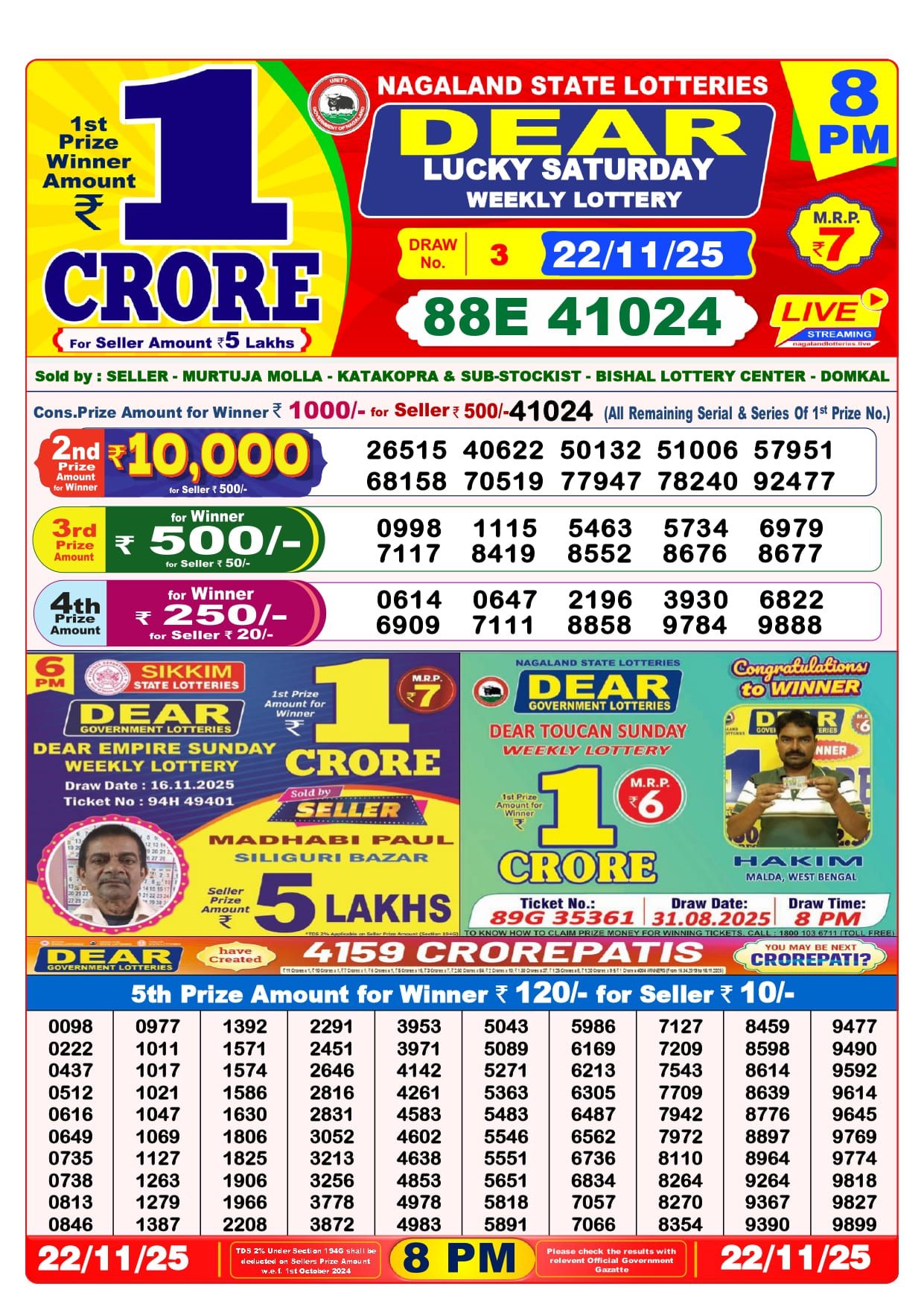 Lottery Sambad 22 Tarik 6 PM
