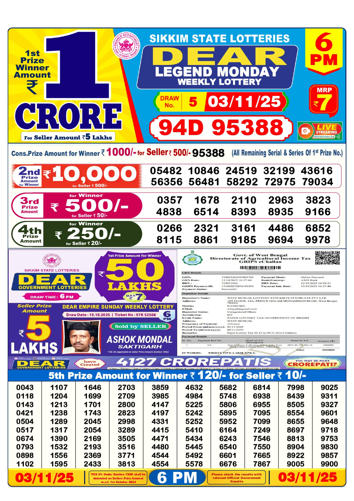 Lottery Sambad 3 Tarik 6 pm. The Nagaland State Lottery Department has released today’s results. Check your today’s fortune result. This Lottery Sambad 3 Tarik 6 pm has a 1st prize of 1 crore, 2nd Prize of 9000 Rupees, 3rd Prize of 450 Rupees, 4th Prize of 250 Rupees and 5th Prize of 120 Rupees. Today Lottery Sambad 3 Tarik 6 PM 1st Prize is – 94D 95388, 2nd Prize– 05482 10846 24519 32199 43616 56356 56481 58292 72975 79034, 3rd Prize– 0357 1678 2110 2963 3823 4838 6514 8393 8935 9166, 4th Prize– 0266 2321 3161 4486 6852 8115 8861 9185 9694 9978 and more results are given below.