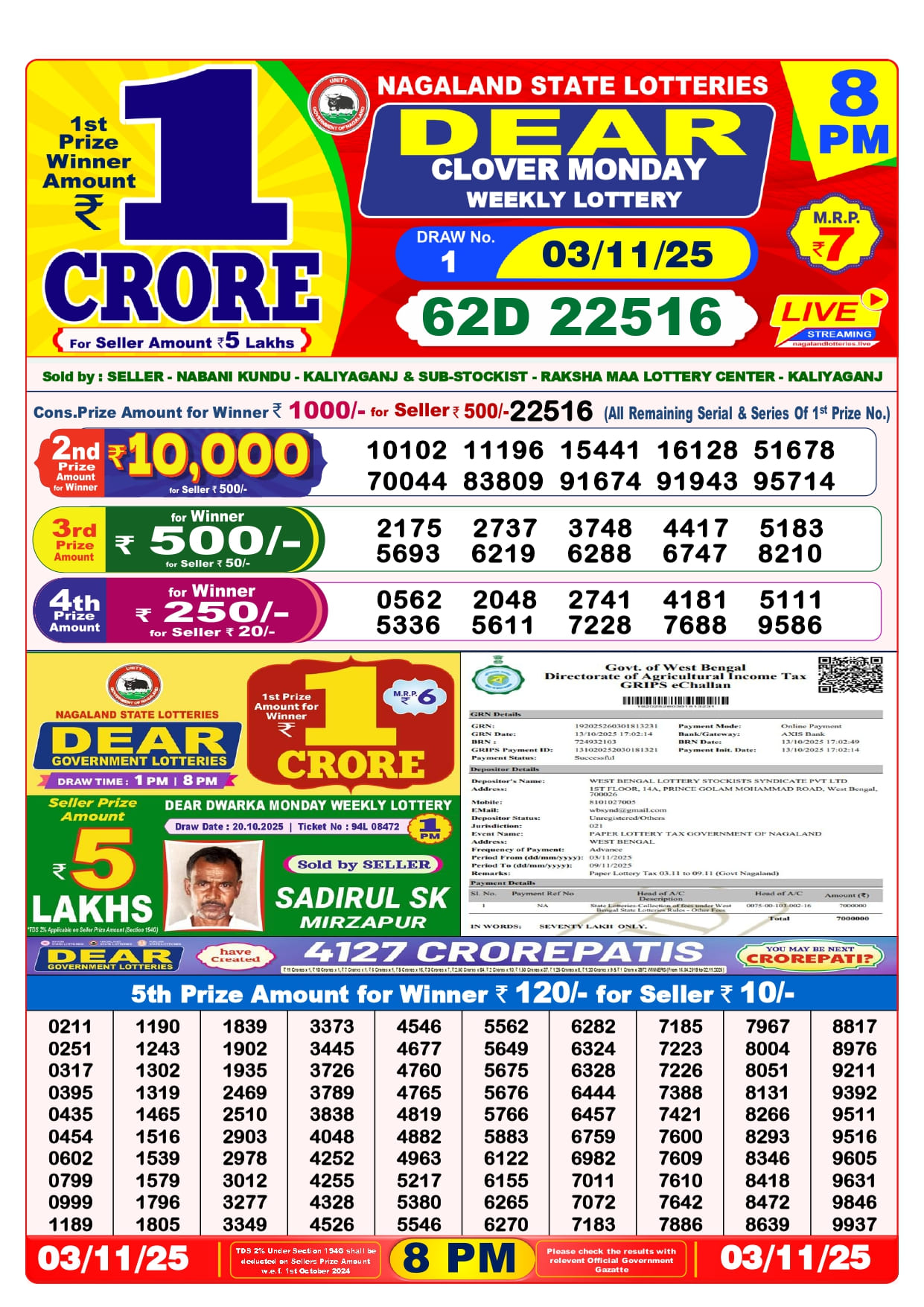 Lottery Sambad 3 Tarik 8 pm. The Nagaland State Lottery Department has released today’s results. Check your today’s fortune result. This Lottery Sambad 3 Tarik 8 pm has a 1st prize of 1 crore, 2nd Prize of 9000 Rupees, 3rd Prize of 450 Rupees, 4th Prize of 250 Rupees and 5th Prize of 120 Rupees. Today Lottery Sambad 3 Tarik 8 PM 1st Prize is – 62D 22516, 2nd Prize– 10102 11196 15441 16128 51678 70044 83809 91674 91943 95714, 3rd Prize– 10102 11196 15441 16128 51678 70044 83809 91674 91943 95714, 4th Prize– 2175 2737 3748 4417 5183 5693 6219 6288 6747 8210 and more results are given below.