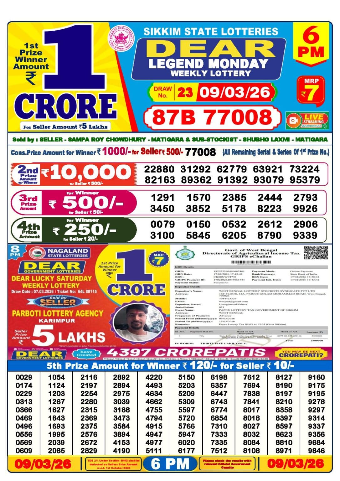 Do you want to see the result of Lottery Sambad 9 Tarik 1 PM, 6 PM and 8 PM? Then you have come to the right place. We publish all results of Nagaland State Lottery, Lottery Sambad Morning Draw List, Lottery Sambad Night Draw List, Lottery Sambad Evening Draw List, Sambad Lottery Result, and Lottery Result Sambad on this website every day at the right time. This Lottery Sambad 9 Tarik has a 1st prize of 1 crore, 2nd Prize of 9000 Rupees, 3rd Prize of 450 Rupees, 4th Prize of 250 Rupees and 5th Prize of 120 Rupees. Nagaland State Lottery department released Lottery Sambad 9 Tarik Result. Today’s result is given below.