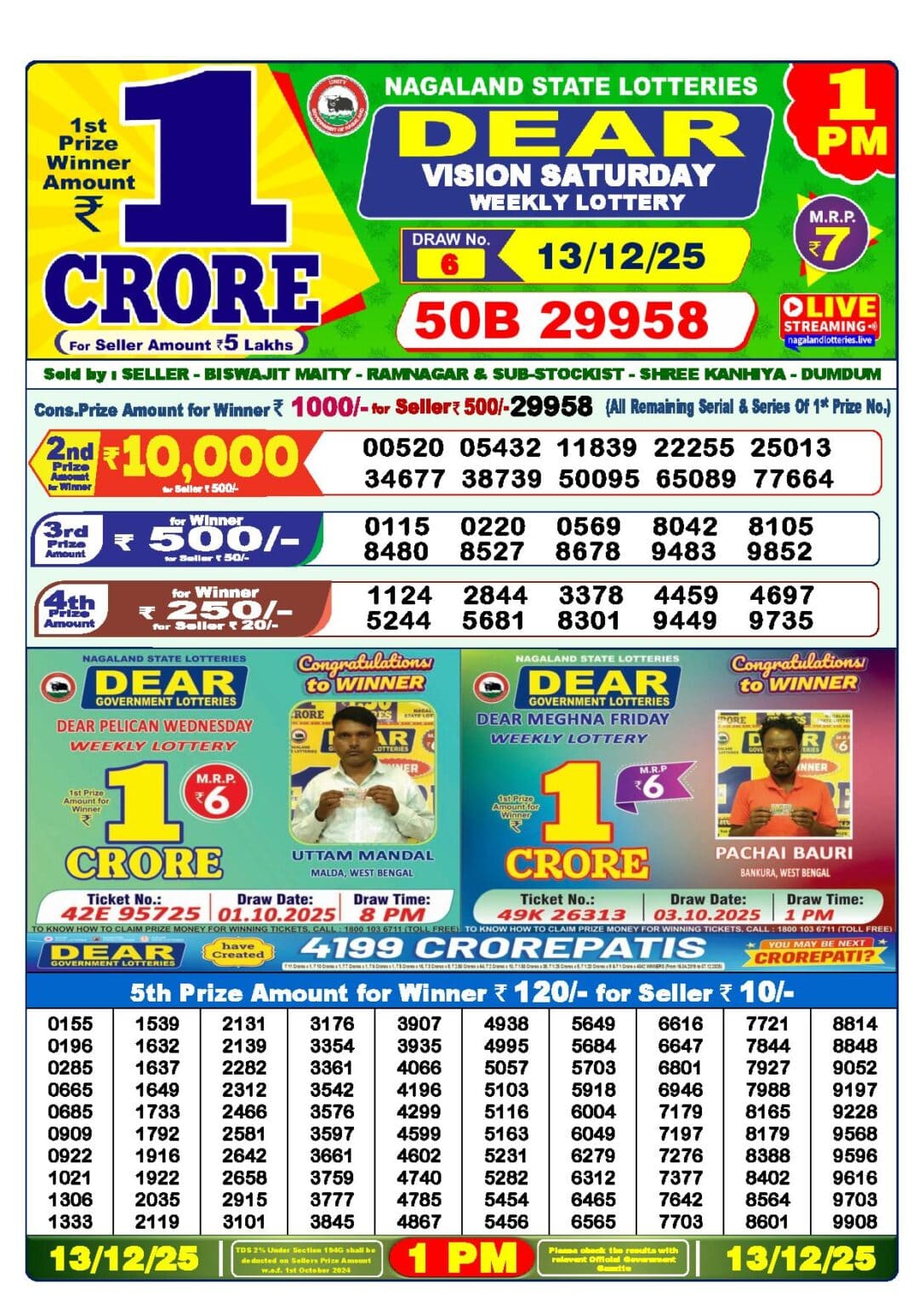 Do you want to see the result of Nagaland Lottery 13 Tarik 1 PM, 6 PM and 8 PM? Then you have come to the right place. We publish all results of Nagaland State Lottery, Lottery Sambad Morning Draw List, Lottery Sambad Night Draw List, Lottery Sambad Evening Draw List, Sambad Lottery Result, and Lottery Result Sambad on this website every day at the right time. This Nagaland Lottery 13 Tarik has a 1st prize of 1 crore, 2nd Prize of 9000 Rupees, 3rd Prize of 450 Rupees, 4th Prize of 250 Rupees and 5th Prize of 120 Rupees. Nagaland State Lottery Department released the Nagaland Lottery 13 Tarik Result. Today’s result is given below.