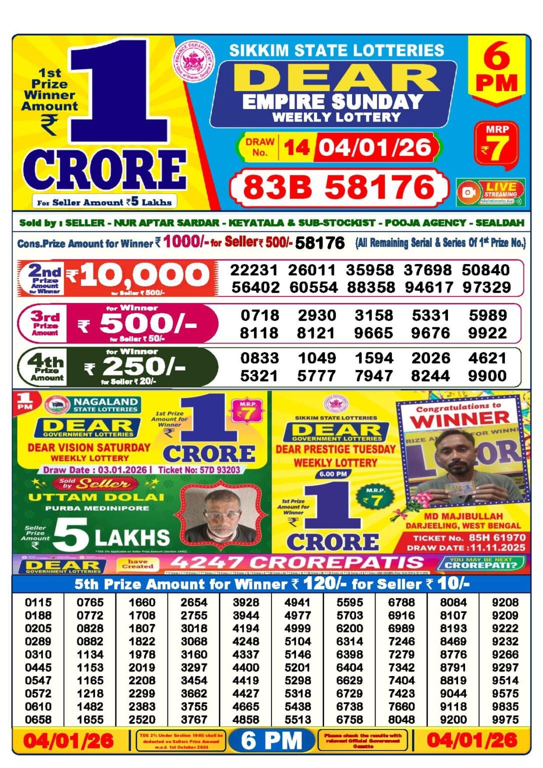 Nagaland Lottery 4 Tarik 6 pm. The Nagaland State Lottery Department has released today’s results. Check your today’s fortune result. This Nagaland Lottery 4 Tarik 6 pm has a 1st prize of 1 crore, 2nd Prize of 9000 Rupees, 3rd Prize of 450 Rupees, 4th Prize of 250 Rupees and 5th Prize of 120 Rupees. Today Nagaland Lottery 4 Tarik 6 PM 1st Prize is – 85L 62997, 2nd Prize– 07114 18101 42583 54113 60142 63509 67285 76422 96237 99207, 3rd Prize– 0373 1260 2657 4623 4899 6000 6113 7921 8611 9268, 4th Prize– 2311 3405 5291 6468 7863 8109 8558 8989 9062 9443 and more results are given below.