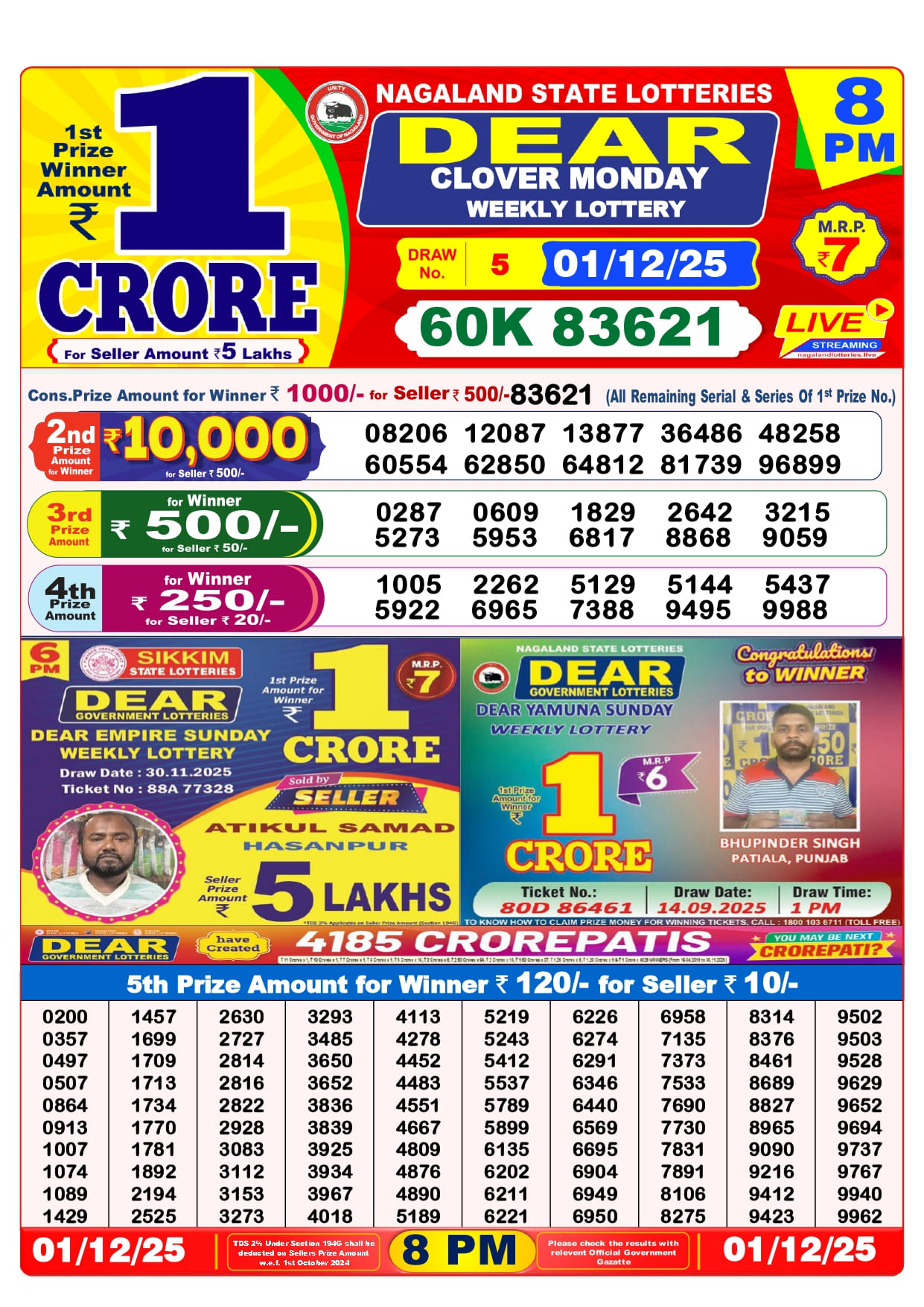 Nagaland State Lottery 1 Tarik 8 pm. The Nagaland State Lottery Department has released today’s results. Check your today’s fortune result. This Nagaland State Lottery 1 Tarik 8 pm has a 1st prize of 1 crore, 2nd Prize of 9000 Rupees, 3rd Prize of 450 Rupees, 4th Prize of 250 Rupees and 5th Prize of 120 Rupees. Today Nagaland State Lottery 1 Tarik 8 PM 1st Prize is – 60K 83621, 2nd Prize– 08206 12087 13877 36486 48258 60554 62850 64812 81739 96899, 3rd Prize– 0287 0609 1829 2642 3215 5273 5953 6817 8868 9059, 4th Prize– 1005 2262 5129 5144 5437 5922 6965 7388 9495 9988 and more results are given below.