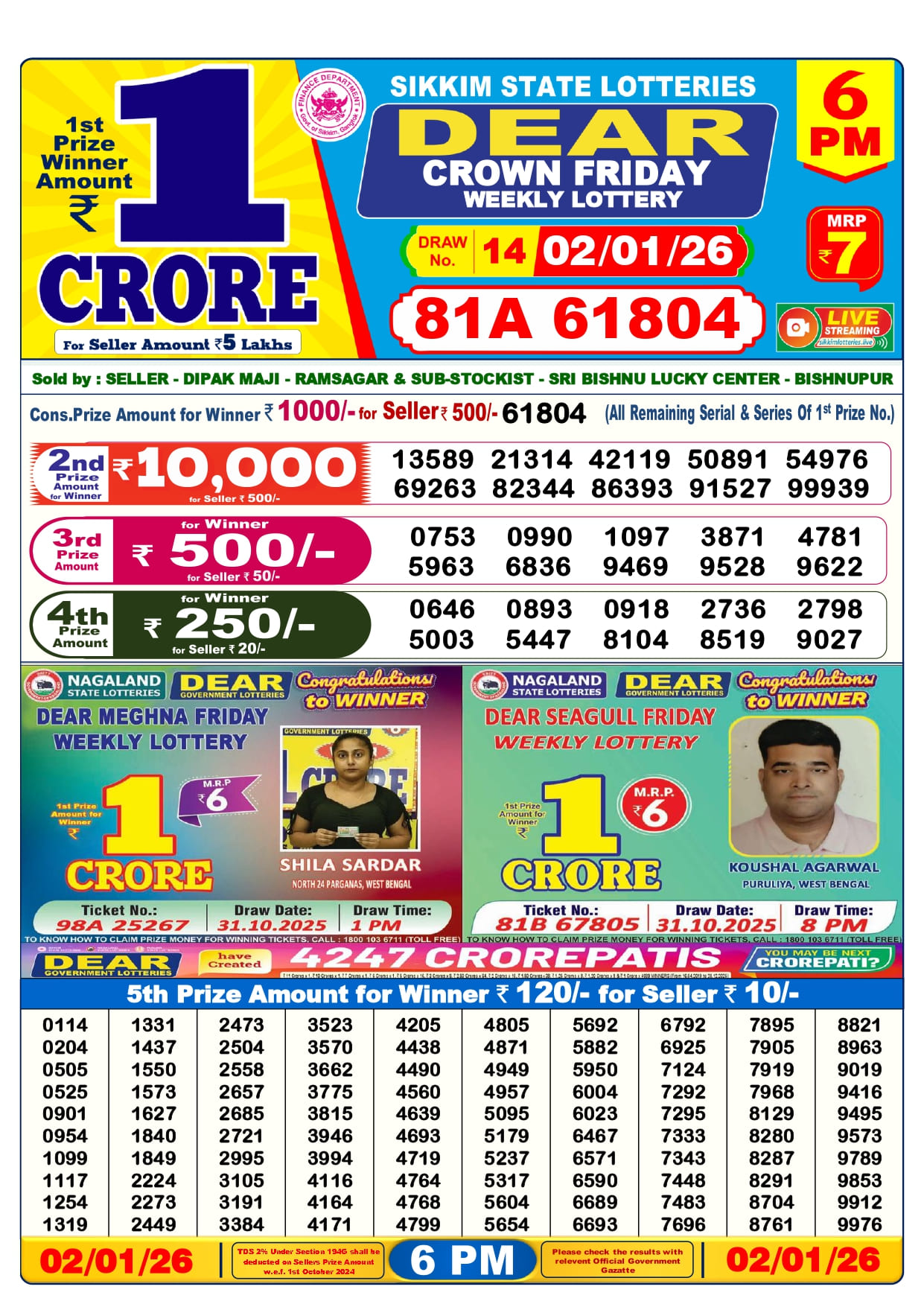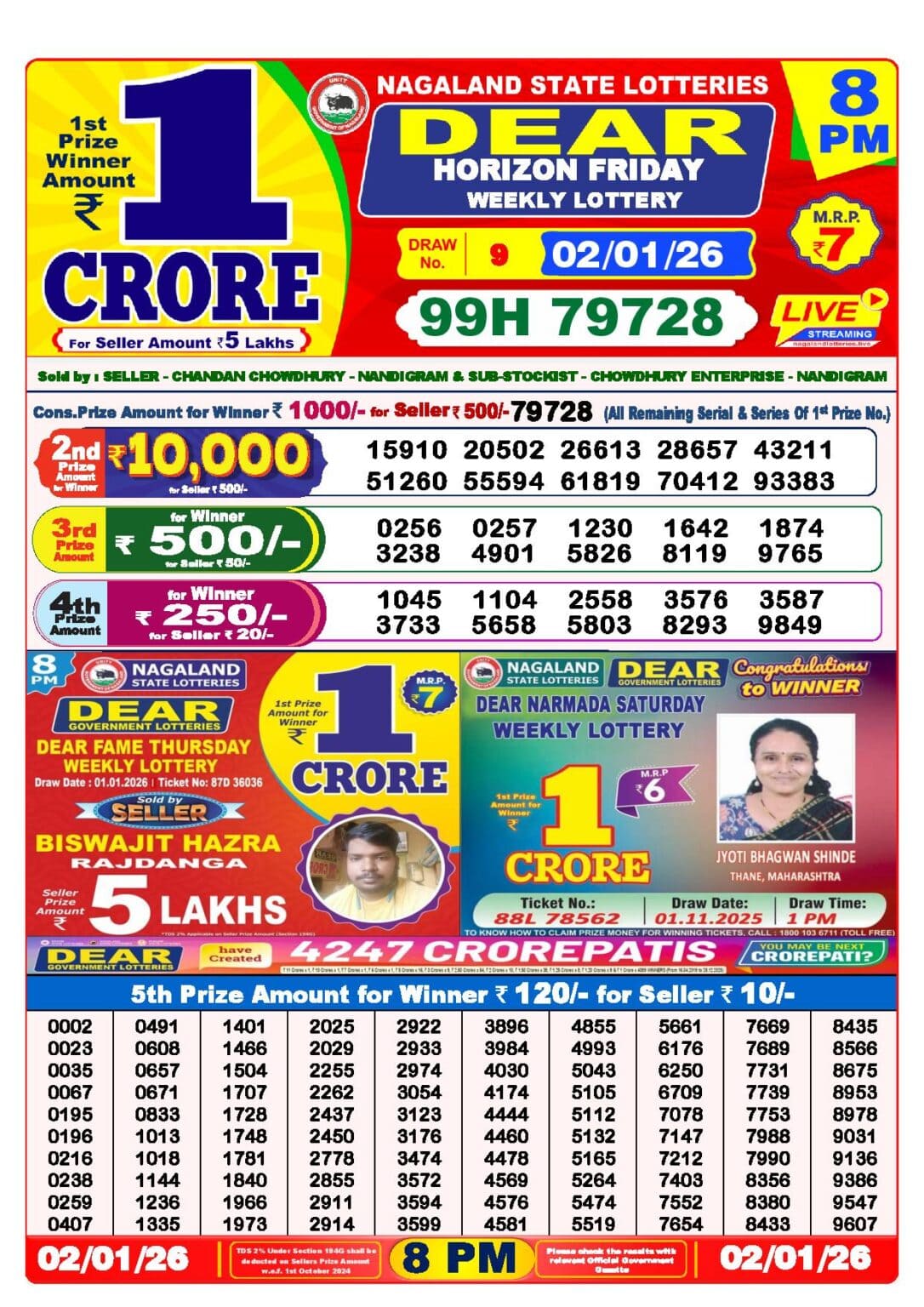 Nagaland State Lottery 2 Tarik 1 pm. The Nagaland State Lottery Department has released today’s results. Check your today’s fortune result. This Nagaland State Lottery 2 Tarik 1 pm has a 1st prize of 1 crore, 2nd Prize of 9000 Rupees, 3rd Prize of 450 Rupees, 4th Prize of 250 Rupees and 5th Prize of 120 Rupees. Today Nagaland State Lottery 2 Tarik 1 PM 1st Prize is – 83E 98035, 2nd Prize– 19246 24372 39113 50165 67057 68528 69215 72737 73959 82567, 3rd Prize– 0057 0476 1766 3912 4853 5660 5730 6775 7375 9635, 4th Prize– 0150 0691 1274 1325 1627 3507 6192 8119 8193 8311 and more results are given below.