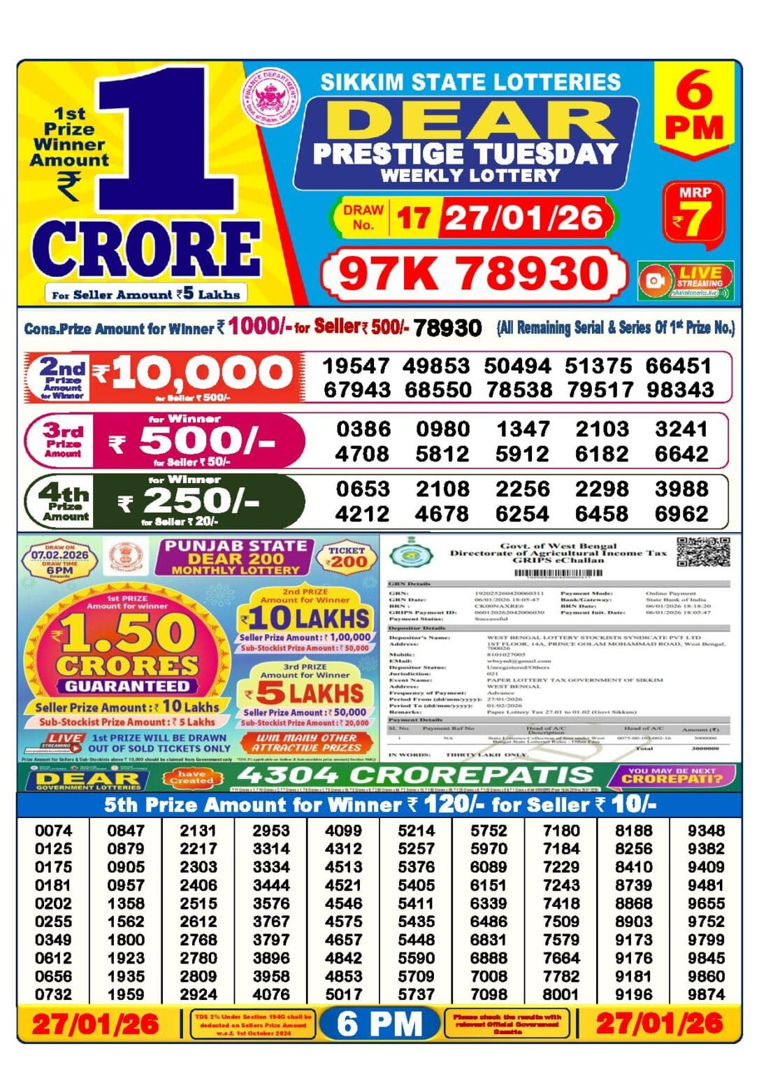 Nagaland State Lottery 27 Tarik 6 pm. The Nagaland State Lottery Department has released today’s results. Check your today’s fortune result. This Nagaland State Lottery 27 Tarik 6 pm has a 1st prize of 1 crore, 2nd Prize of 9000 Rupees, 3rd Prize of 450 Rupees, 4th Prize of 250 Rupees and 5th Prize of 120 Rupees. Today Nagaland State Lottery 27 Tarik 6 PM 1st Prize is – 85C 66264, 2nd Prize– 18037 19350 25917 26858 39776 42844 81333 83687 84399 96150, 3rd Prize– 0043 2619 2824 3995 4318 8188 8442 8755 9385 9507, 4th Prize– 1364 2406 3009 5166 5304 5654 6530 6905 8163 8249 and more results are given below.