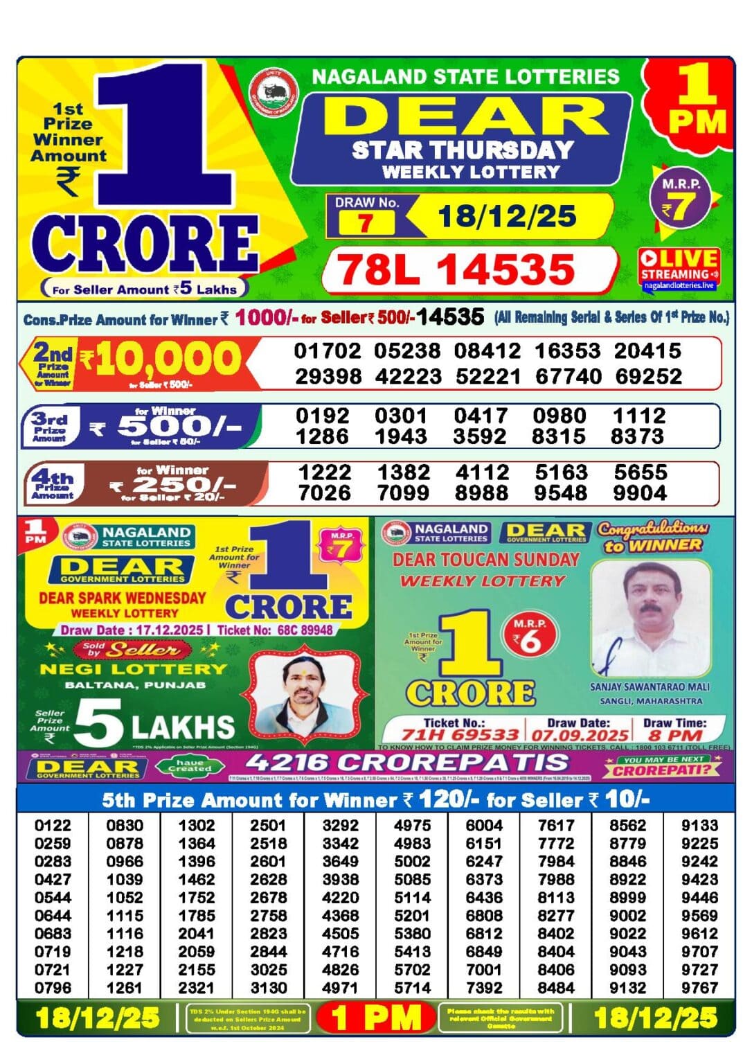 Nagaland State Lottery Result 18-12-2025 Today 1PM, 6PM, 8PM, Winners List (OUT) LIVE Download.