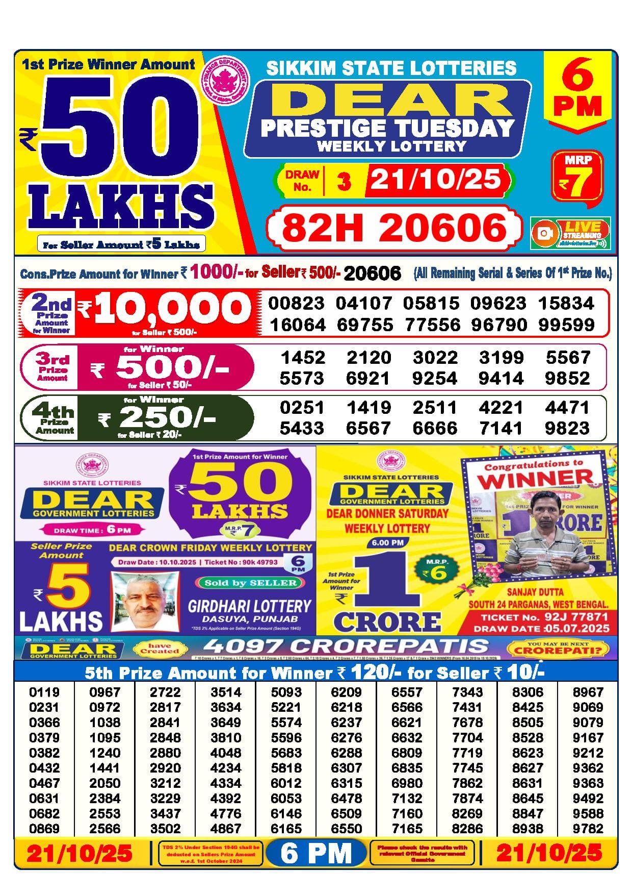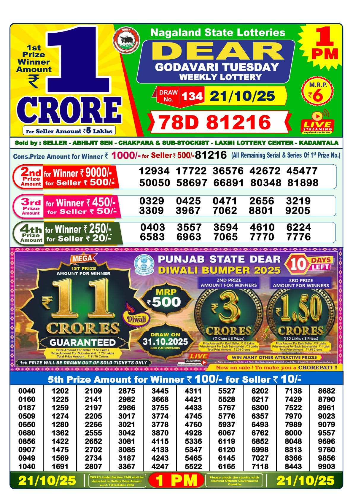 Nagaland State Lottery Result 21-10-2025 Today 1PM, 6PM, 8PM, Winners List (OUT) LIVE Download.