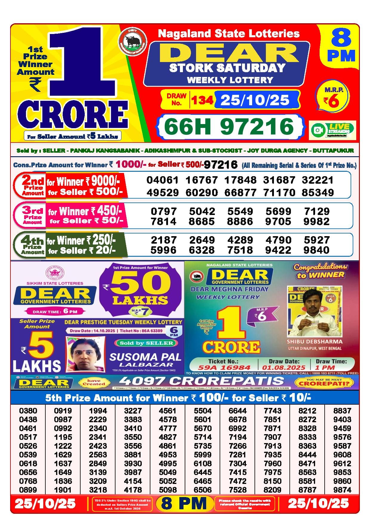 Nagaland State Lottery Result 25-10-2025 Today 1PM, 6PM, 8PM, Winners List (OUT) LIVE Download.