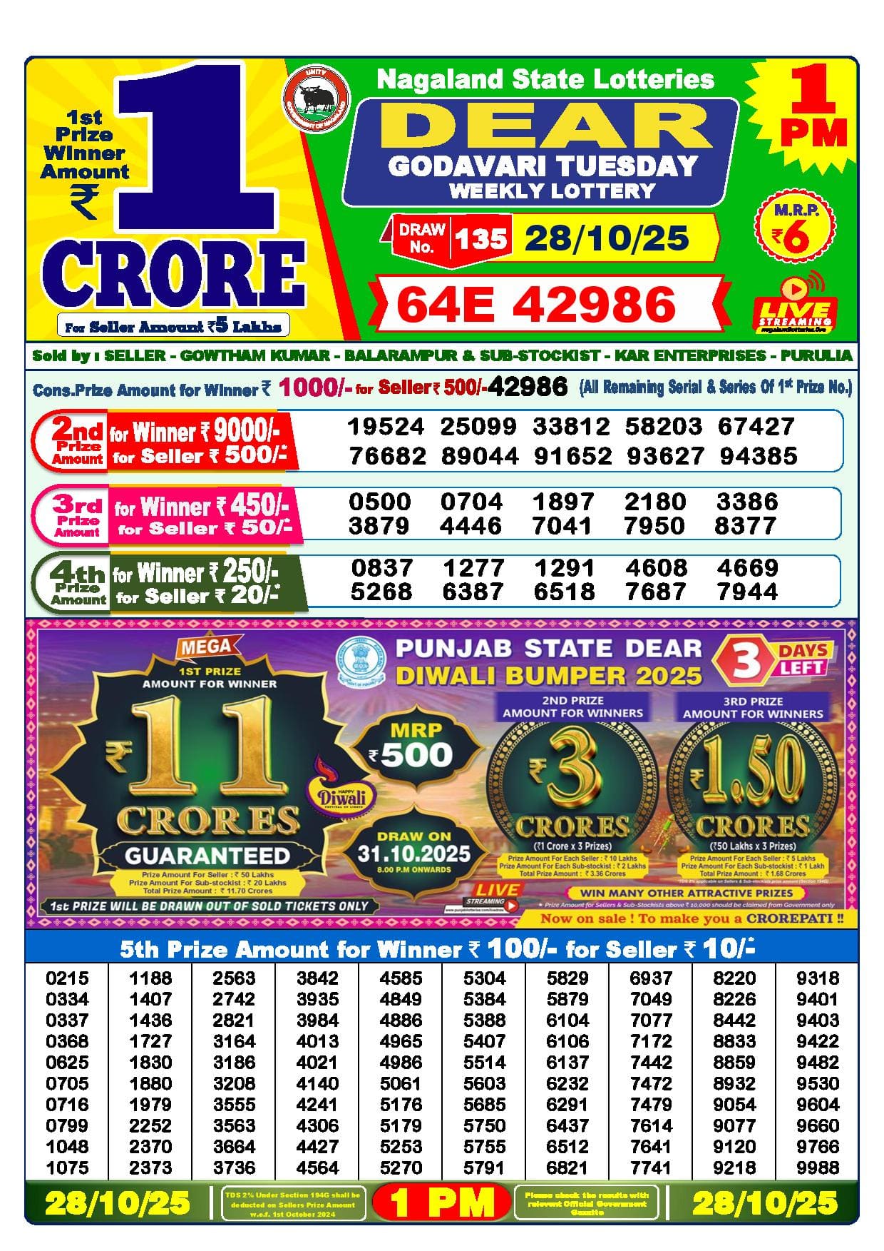 Nagaland State Lottery Result 28-10-2025 Today 1PM, 6PM, 8PM, Winners List (OUT) LIVE Download.
