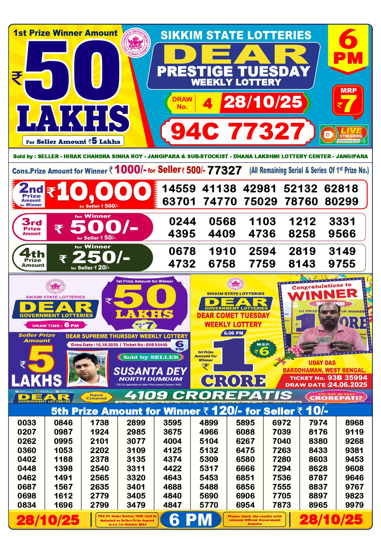 Nagaland State Lottery Result Today 6pm has been released by the Nagaland State Lottery department. Check your today’s fortune result. This Nagaland State Lottery Result Today 6pm has a 1st prize of 1 crore, 2nd Prize of 9000 Rupees, 3rd Prize of 450 Rupees, 4th Prize of 250 Rupees and 5th Prize of 120 Rupees. Nagaland State Lottery Result Today 6pm 1st Prize is – 94C 77327, 2nd Prize– 14559 41138 42981 52132 62818 63701 74770 75029 78760 80299, 3rd Prize– 0244 0568 1103 1212 3331 4395 4409 4736 8258 9566, 4th Prize– 0678 1910 2594 2819 3149 4732 6758 7759 8143 9755 and more results are given below.